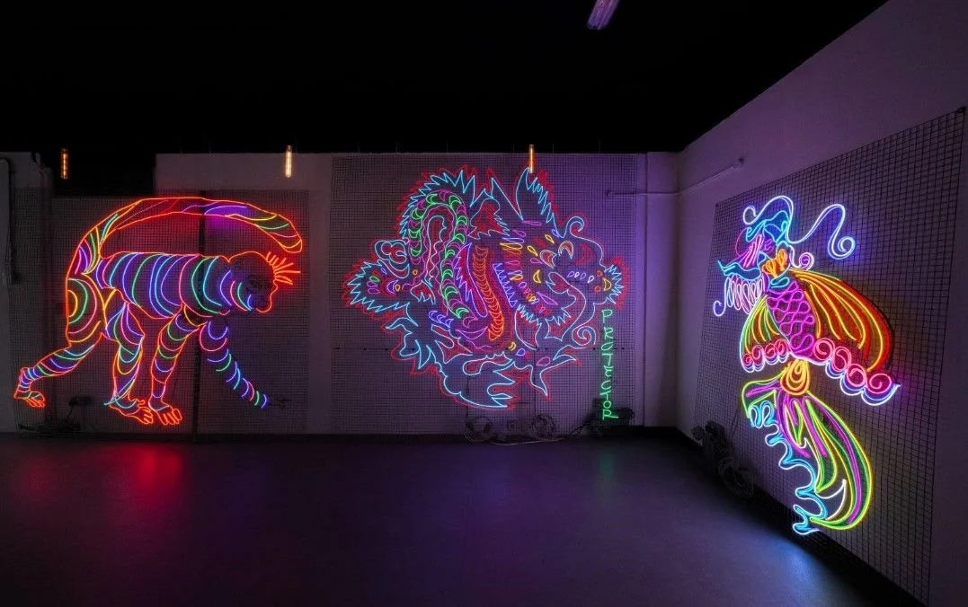 The exhibition will transform Compton Verney’s galleries with Burman’s eclectic mix of influences. Collages featuring Bollywood stars, self-portraits, folk heroines, and vibrant neon sculptures will burst from the walls. A customized Tuk Tuk, covered in shocking pink and embellished with trinkets, will display a screen showing some of Burman’s films, offering a visual journey from Bootle to Bollywood. The largest gallery will be illuminated with neon deities, animals, and mythological creatures, creating a luminous, dreamlike environment.