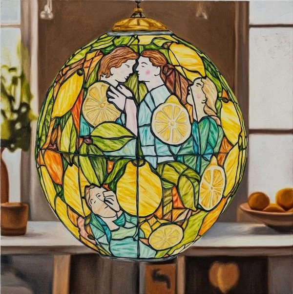 Central to this exhibition is "A Fruitless Bounty?", a mesmerizing large-scale piece that encapsulates Bloom’s duality of precision and chaos. The painting depicts a stained-glass orb hanging from the wooden rafters of an attic, surrounded by a flock of green parakeets drawn to its light. The orb, featuring the image of a vibrant fruit tree, presents a beautiful yet brittle illusion of abundance. This ironic twist—where the glass fruit tree signifies both beauty and fragility—provokes a deeper contemplation on the nature of commemoration and the subtle violence embedded within the act of preservation.