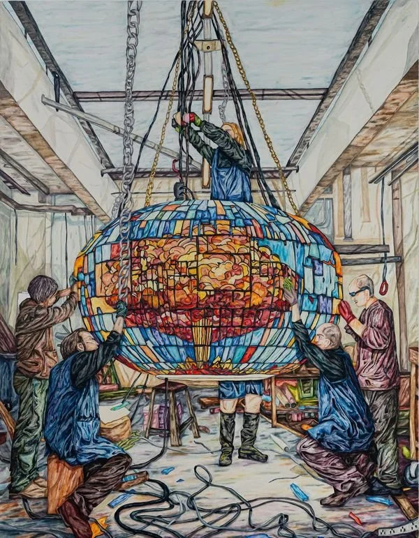 Bloom’s narrative extends beyond static imagery, inviting viewers into an interactive dialogue with his art. In "But Wasn’t It Beautiful?", he juxtaposes the careful restoration of a stained-glass orb depicting an atomic explosion with the inherent fragility of the material. This piece highlights the irony of memorializing destruction through a medium as delicate as glass. Other works, like "Blokes" and "What Seems to Be the Problem," evoke a more subtle tension. Muscular figures manipulate the orbs in ways that suggest both creation and potential destruction, prompting viewers to reflect on the ambiguous rituals depicted and the fine line between harm and healing.
