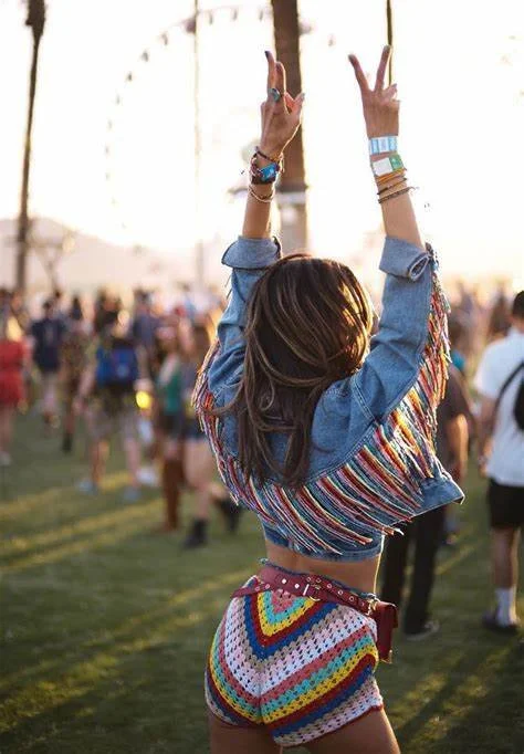 Light, airy fabrics like chiffon and cotton in maxi lengths are popular for their comfort and boho-chic aesthetic. Fringes and tassels add a playful and dynamic element to outfits, seen on everything from jackets to bags. These elements bring movement and flair to your festival ensemble, perfect for twirling under the summer sun and capturing that carefree, bohemian spirit.
