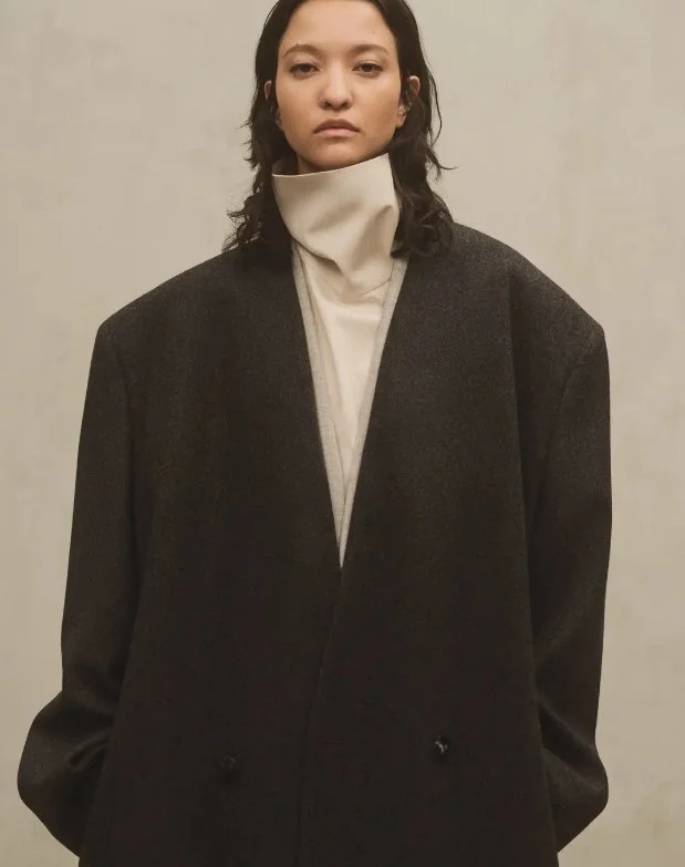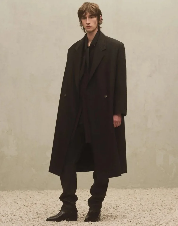 Building upon the initial reveal, the Fall/Winter 2024 collection continues to showcase Fear of God’s refined palette with new, intricate details. Signature elements like oversized tailoring, clean coats, and sculpturally refined tops are paired with distressed denim and precisely cut pants. The magic of this collection lies in its multidimensional textured fabrics, featuring fuzzy wools, faux fur, sherpa, cracked leather, and suede fringe, all contributing to the brand’s architectural yet relaxed silhouettes. The muted, natural colour palette—chocolate, deep charcoal, stone grey, camel, and taupe—stays true to the brand's aesthetic.