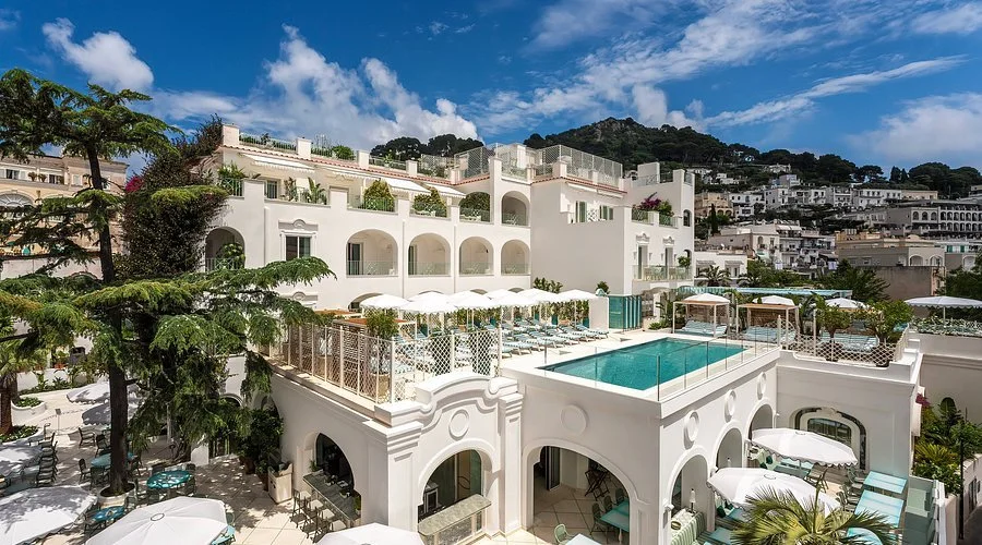 Capri’s very first hotel got a major glow-up in 2023, and now it’s a dreamy neoclassical hangout where white curtains billow like togas and the crowd looks like they’ve just stepped off a private jet (they probably have). The rooms are all breezy whites and sky blues, and the pastry counter downstairs is run by a master chef. Upstairs, Michelin-starred Gennaro Esposito works his magic on the roof terrace. But the real flex? Scoring a spot at the hotel’s Da Gioia beach club because sun loungers on Capri are harder to book than a Birkin.