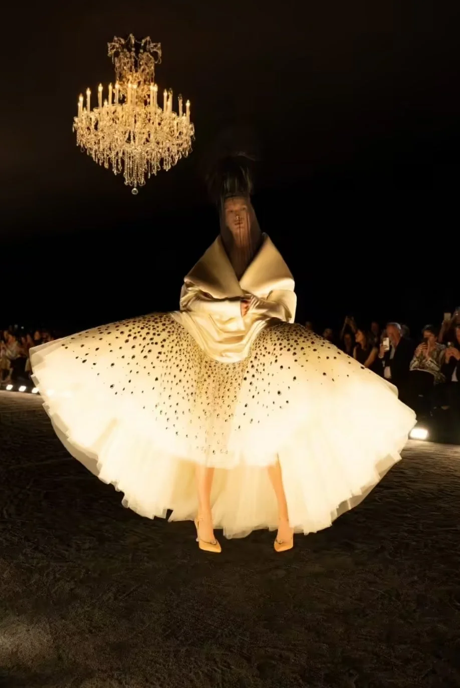 Daniel Roseberry presented what could only be described as one of his best collections since joining Schiaparelli, eschewing gimmicks, props, and influencers like Kylie Jenner with her infamous tiger head from last year. Instead, he focused on craftsmanship through a cinematic quality runway show in a blackout room where fabrics, drapes, and textures spoke through a visual and artistic language.