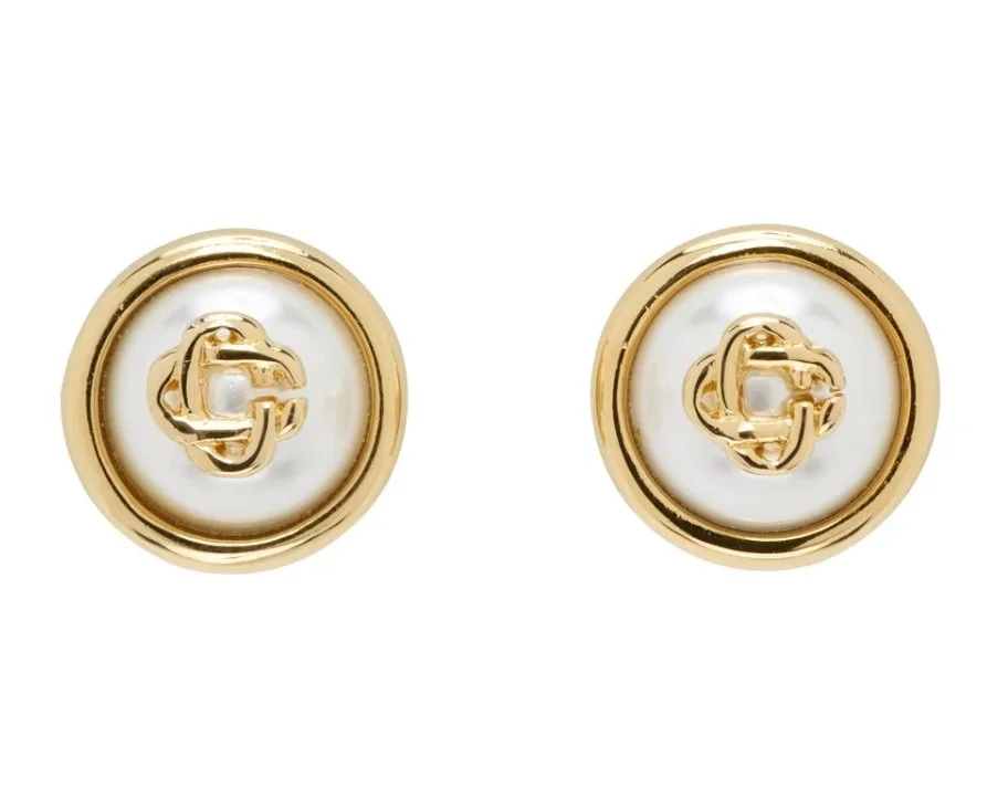 Gold & White Pearl Logo Stud Earrings
