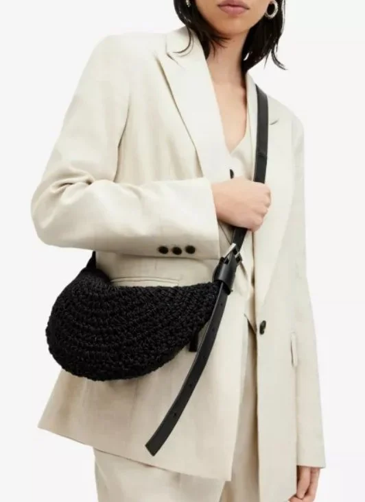 The ALLSAINTS Half Moon woven cross-body bag combines a unique woven design with practicality, making it a stylish and versatile accessory for everyday use.