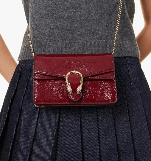 The GUCCI Mini Dionysus chain-strap leather shoulder bag blends classic luxury with contemporary edge, featuring the iconic tiger head closure and a chain shoulder strap, perfect for adding a statement to any outfit.