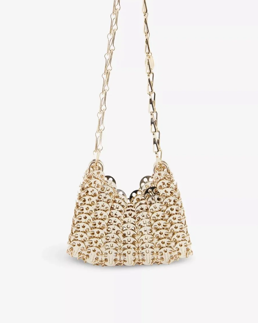 The RABANNE 1969 Nano metal shoulder bag captivates with its iconic chainmail construction and avant-garde style, making it a striking statement piece for any bold fashion ensemble.