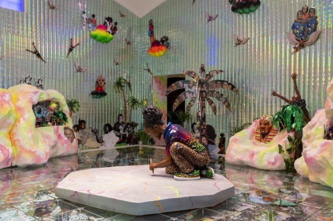 Lauren Halsey’s Emajendat transforms Serpentine South into an immersive “Funk garden,” merging South Central LA’s vibrant culture with African diaspora and queer iconography. Halsey’s first solo UK exhibition celebrates resistance, community, and the fight against gentrification, offering a dynamic, multi-sensory experience.