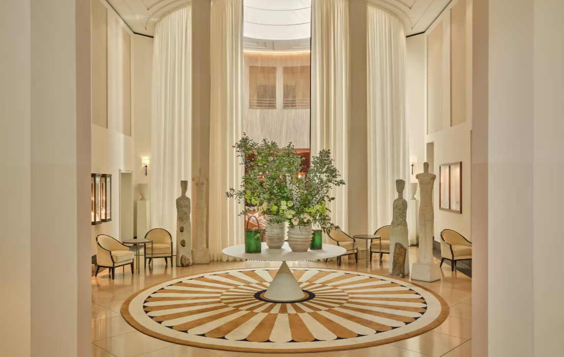 The newly redesigned lobby makes a first impression in the way that only truly great hotels can — dramatically, but never shouty. There’s a grand floral display on a central table, sculptures that nod to classicism without veering into cliché, and curved plasterwork by French artist François Mascarello that’s more gallery wall than hotel wall. It’s elegant, it’s surprising, and it’s exactly the kind of space you’d expect to check into while carrying Loewe.