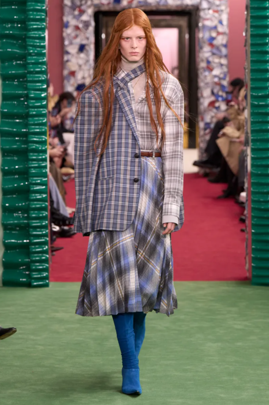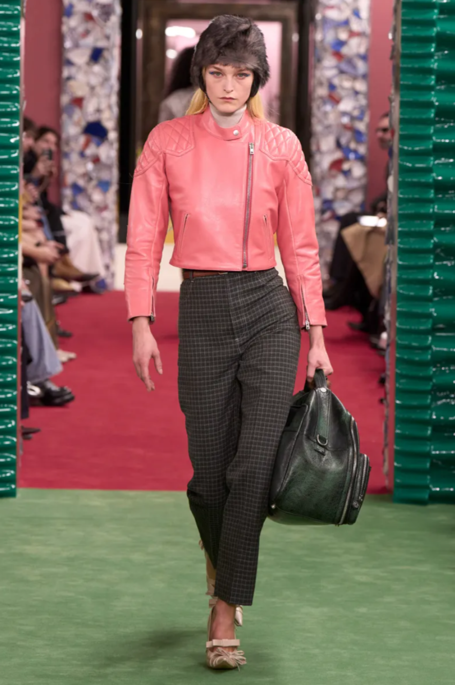Johansson leaned into a gently aristocratic mood, inspired partly by his affection for the royal drama The Crown. Box pleated tweed skirts, riding suits and prim twinsets suggested a wardrobe fit for country weekends, while silk scarves trailed dramatically behind the models. Yet this being Acne Studios, the polish never remained entirely proper. Classic biker jackets appeared in shrunken pastel versions, and tailored beige blazers were styled with cable knits, floral print trousers and exaggerated pointed boots trimmed with fur. The soundtrack from Portishead underscored the slightly melancholic atmosphere, reinforcing the sense that nostalgia was being filtered through a distinctly modern lens.
