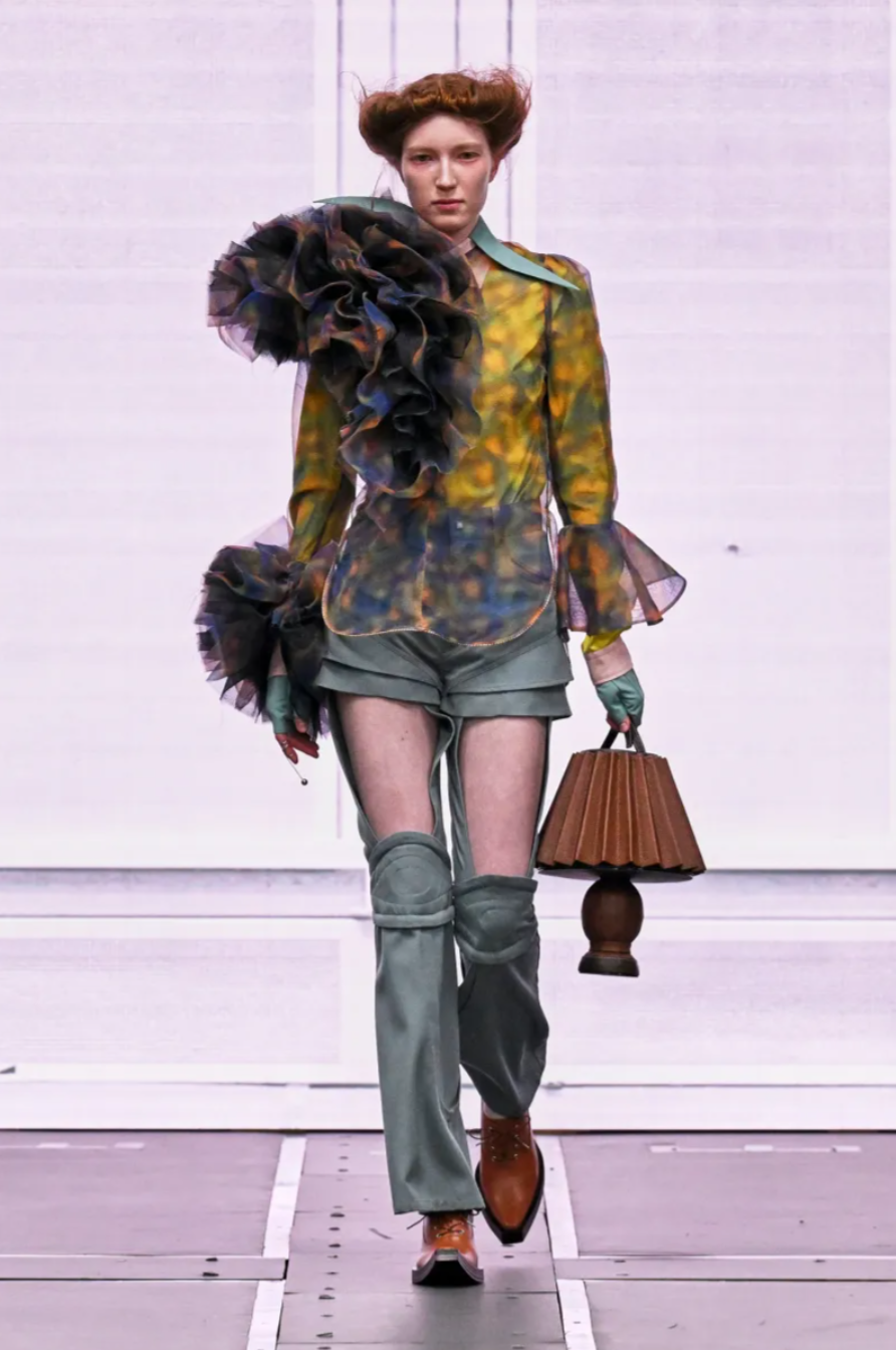 Amid the technical wizardry, Morinaga’s design instincts remained clear. Silhouettes referenced both the softness of flower power and the structure of protective exoskeletons, creating a curious tension that somehow worked. Blurred florals, Liberty-style prints and patchwork flared trousers appeared alongside rounded puffer shapes and exaggerated wired ruffles. The result felt like a cast of characters stepping out of a futuristic narrative, part prairie heroine, part glam rock protagonist, dressed for a world where fashion and technology are no longer separate.