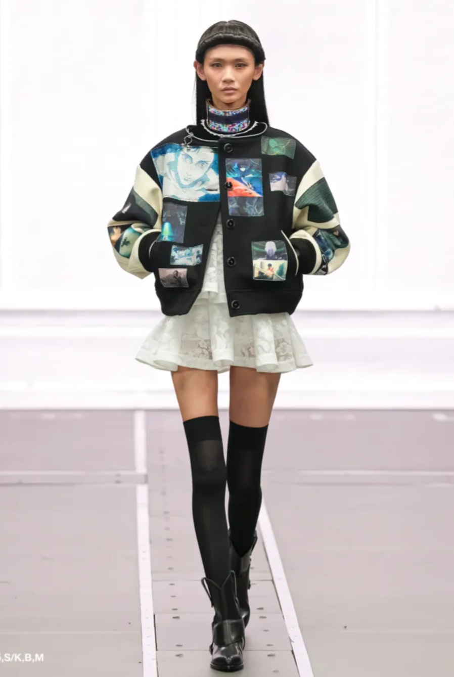 Not every look relied on spectacle, though the innovation remained just as striking. Collars, cuffs and patch-like motifs that appeared to be printed were in fact projections on LED textiles developed with the tech company LED Tokyo. Activated remotely, the designs could transform instantly, suggesting a future where clothing behaves more like a digital interface. Morinaga said backstage that some of these pieces are expected to be developed commercially, bringing the idea of interactive fashion closer to everyday wear.