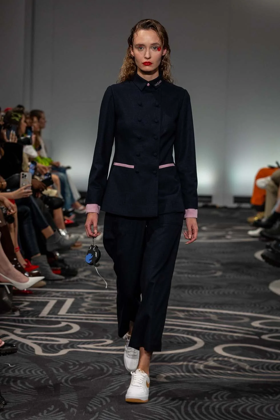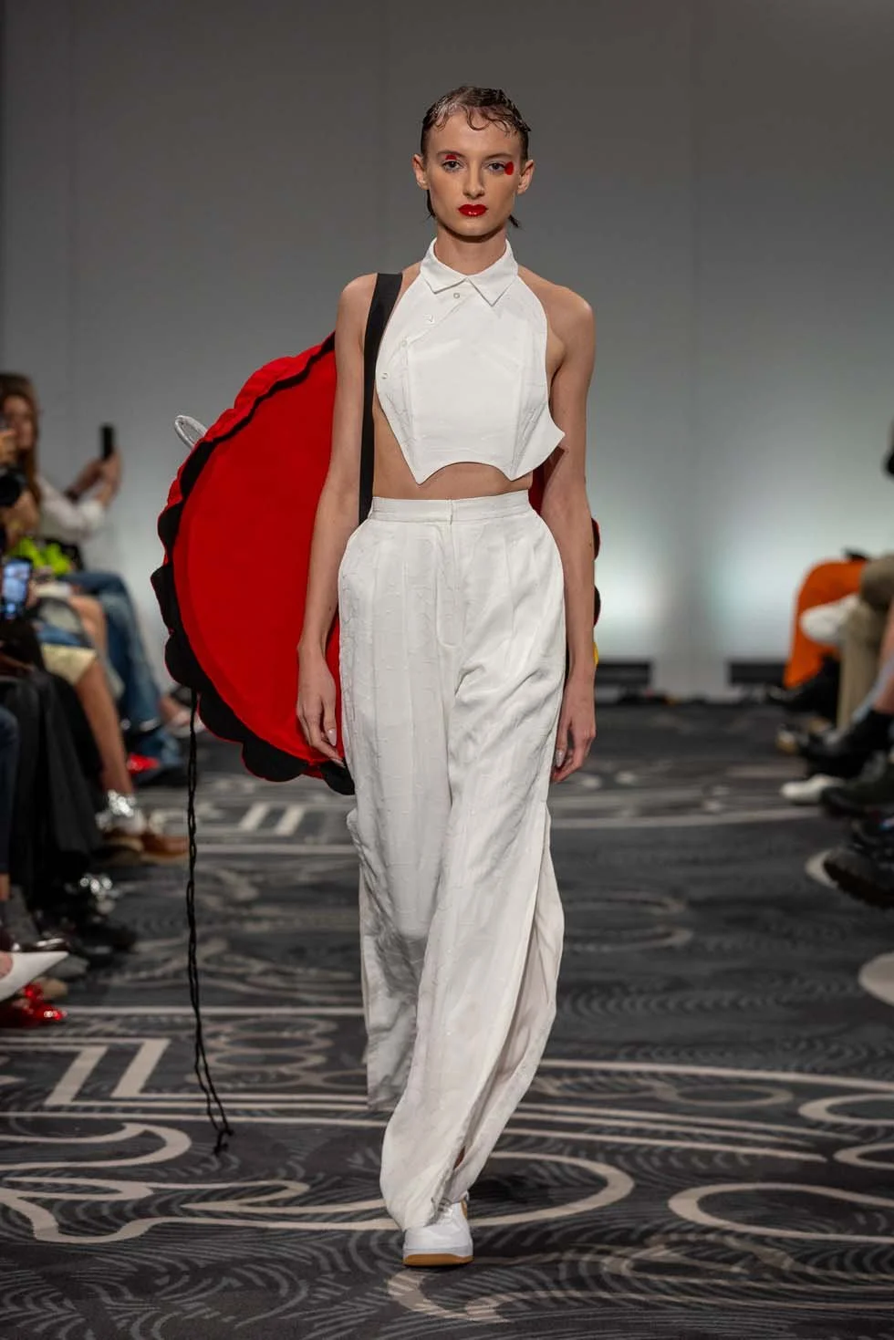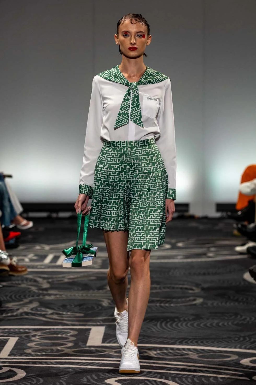 Every look on the runway felt like a magician pulling a new surprise from their hat—archetypes appeared one after another: a student, chess pieces, clowns, a mad hatter, even a rabbit. Yet none of it veered into costume territory. Instead, Apujan’s brilliance lies in his ability to take these symbols of fantasy and elevate them into high fashion, each piece telling its own story while contributing to the larger narrative.