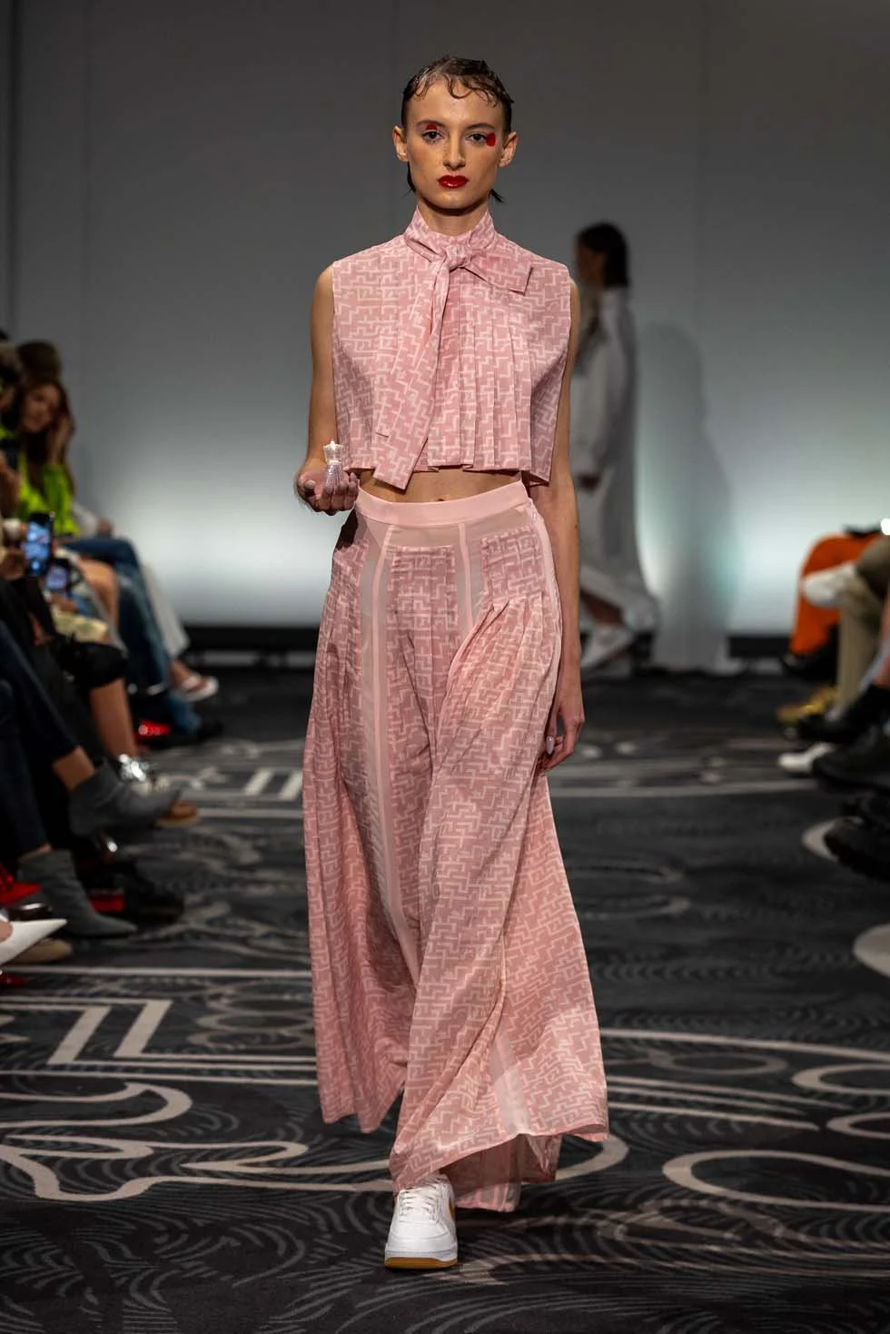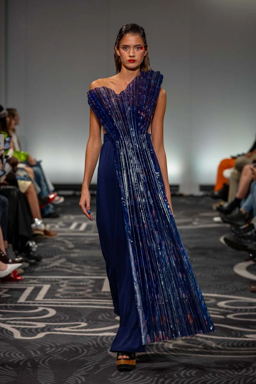 Among the standout pieces: an opening look that set the tone—a black-and-white checkered pirate hat adorned with chess pieces, paired with a dress in the same motif, but in unexpected shades of light and dark green. Then came a full electric-blue ensemble—a chunky knit top with an asymmetric fit, paired with low-rise, wide-leg trousers—that felt both modern and completely in tune with the show’s larger-than-life fantasy.