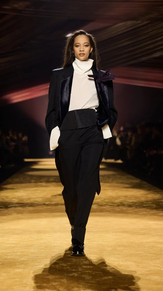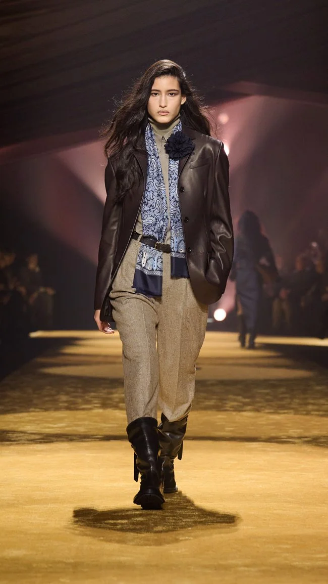 The show’s theme, “Confidence Through Construction,” was evident in both men’s and women’s pieces. Blazers were paired with pleated trousers, nylon trenches fused with brushed alpaca, and double-breasted jackets came reimagined in soft cashmere and supple leather. A highlight was the interplay between formal and functional: suiting worn with equestrian boots, silk scarves knotted over crisp shirts, and monk shoes stamped with cobbler’s nails spelling out “BOSS.” Falcioni’s fascination with texture transformed tailoring into an experience of touch as much as sight, from ostrich-effect leather to knitwear that mimicked woven suiting.