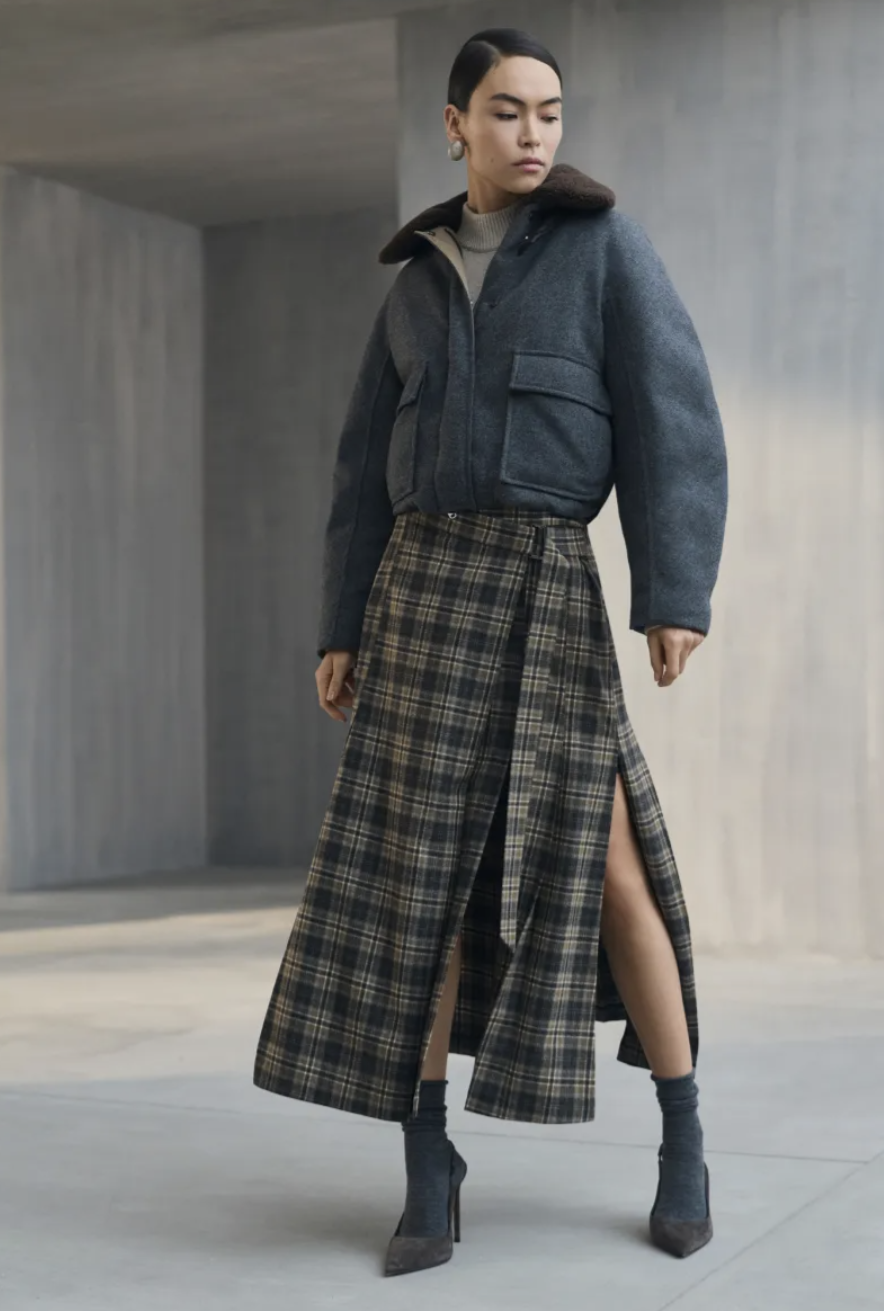 The collection balanced refinement with warmth. Mock fur coats and vests were crafted from knitted mohair and embroidered with sequins that caught the light softly, while tailoring was eased with a rustic romantic sensibility. British heritage patterns took center stage, with checks, tartans, and Prince of Wales motifs reimagined across bombers, jackets, and trouser skirts. There was a sense of effort in every piece, from a crochet cashmere vest that took 30 hours to make by hand to embroidered chevron trousers paired with puffer bombers. The palette leaned into earth tones of browns, creams, and the muted haze of an English countryside, suggesting comfort without surrendering sophistication.