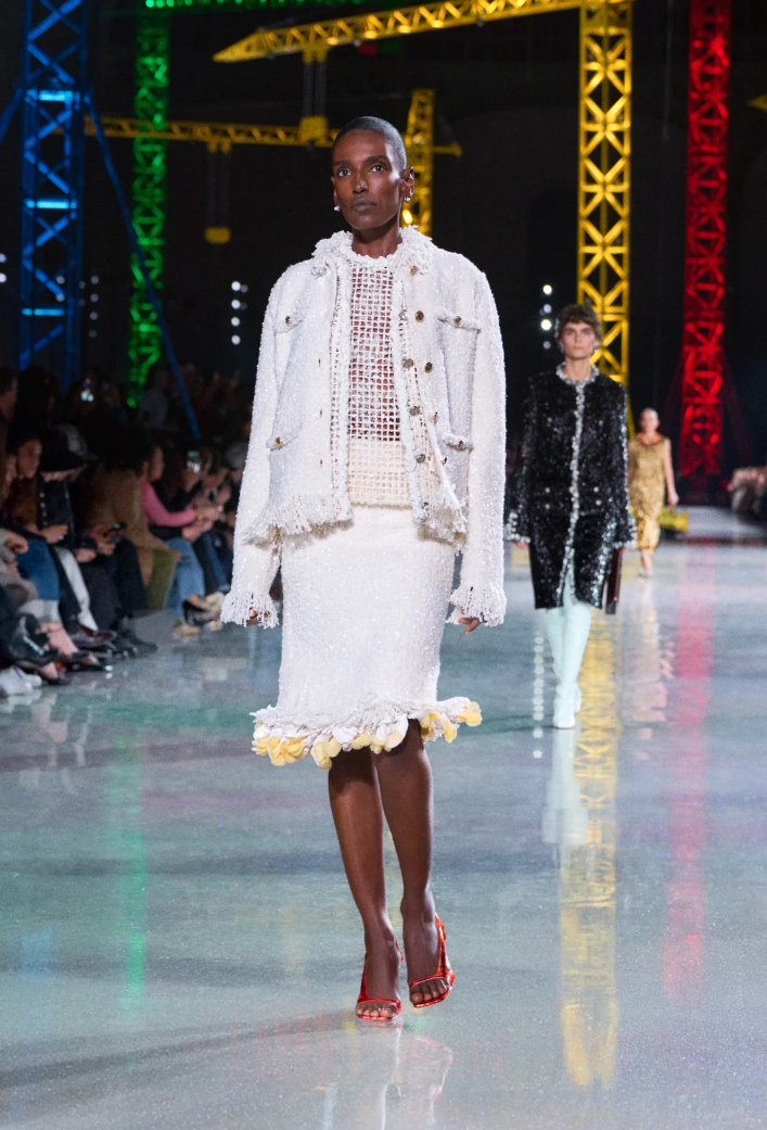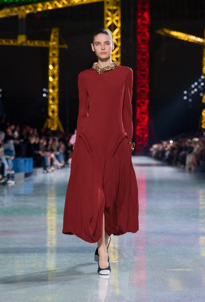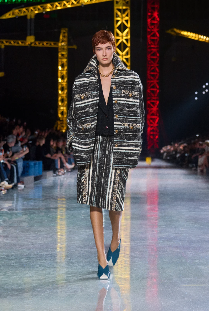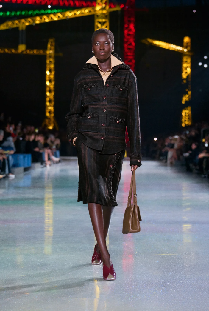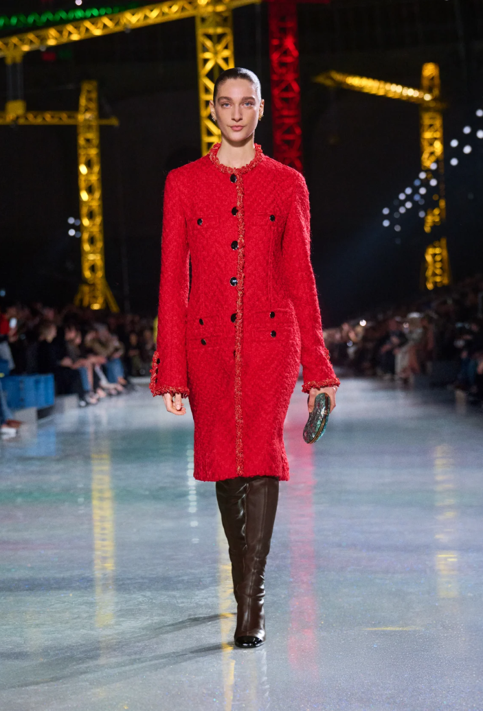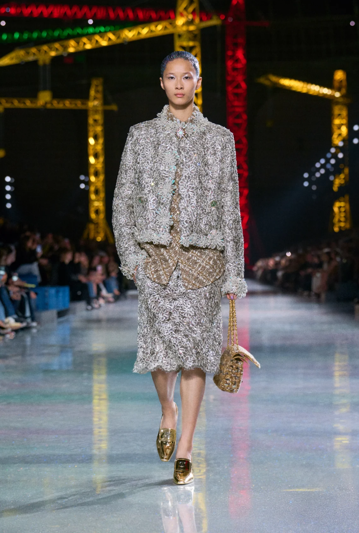 Across the Chanel Fall 2026 show, Blazy proposed a wardrobe grounded in real life while retaining the house’s sense of fantasy. Zip front jackets with brass button pockets opened the runway, paired with knit skirts and dresses that felt both relaxed and polished. Accessories signalled the season’s likely cult pieces within the Chanel Fall Winter 2026 collection, including streamlined top handle work bags and refined two tone heels that updated the house’s classic footwear language. Matching skirt suits remained the central canvas of the Chanel Fall 2026 lineup, reworked with sequins, floral embellishments and intentionally frayed edges. Meanwhile, drop waist silhouettes appeared throughout the collection, offering a softer alternative to tailoring and reinforcing Blazy’s vision of everyday elegance elevated through design.