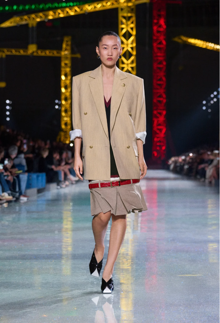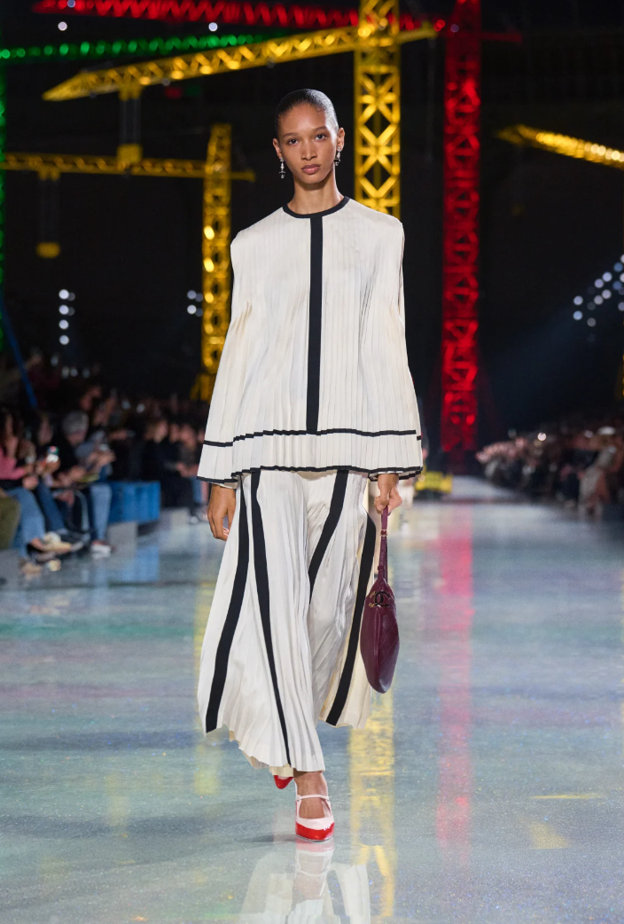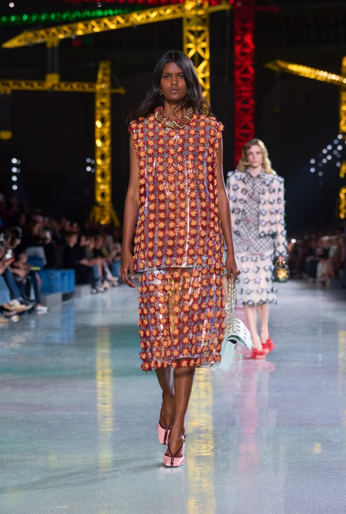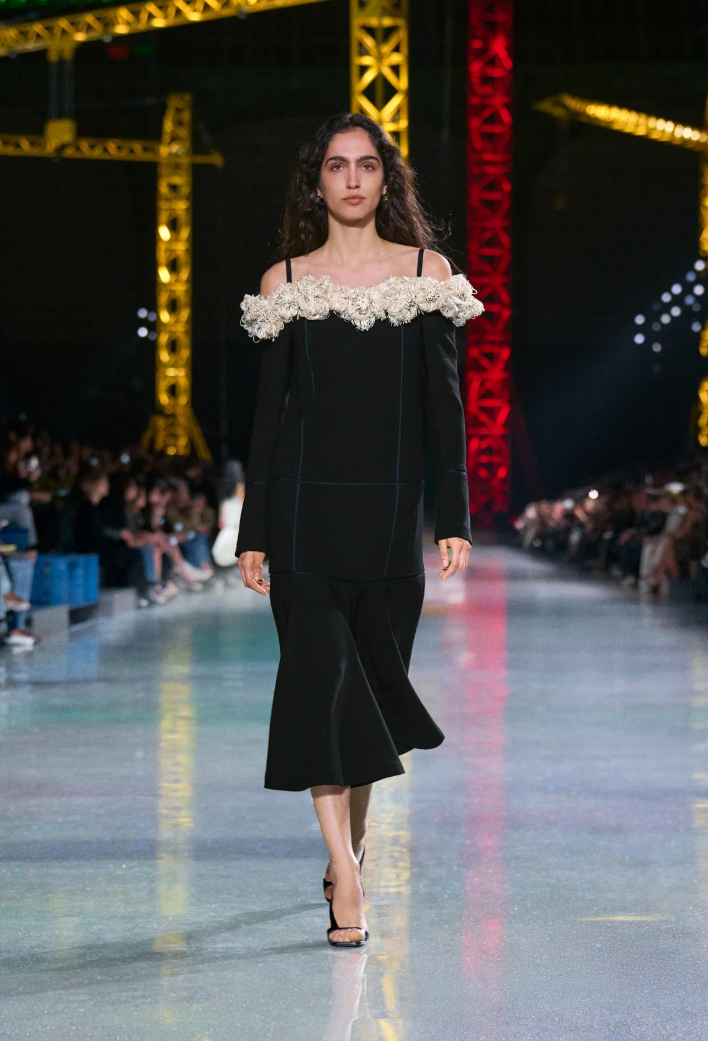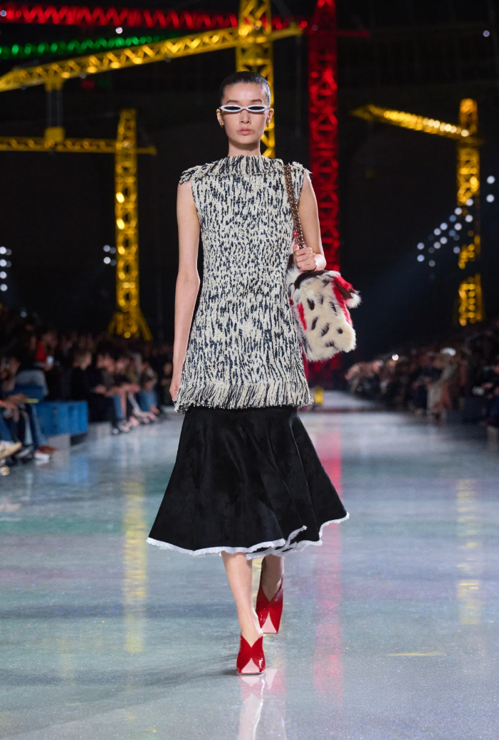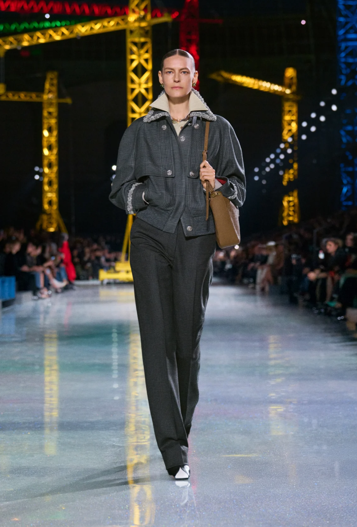 Across the Chanel Fall 2026 show, Blazy proposed a wardrobe grounded in real life while retaining the house’s sense of fantasy. Zip front jackets with brass button pockets opened the runway, paired with knit skirts and dresses that felt both relaxed and polished. Accessories signalled the season’s likely cult pieces within the Chanel Fall Winter 2026 collection, including streamlined top handle work bags and refined two tone heels that updated the house’s classic footwear language. Matching skirt suits remained the central canvas of the Chanel Fall 2026 lineup, reworked with sequins, floral embellishments and intentionally frayed edges. Meanwhile, drop waist silhouettes appeared throughout the collection, offering a softer alternative to tailoring and reinforcing Blazy’s vision of everyday elegance elevated through design.