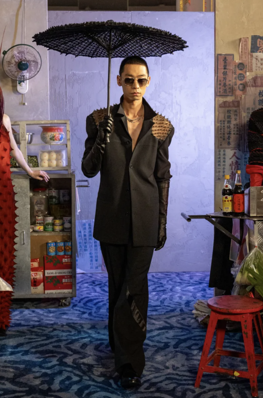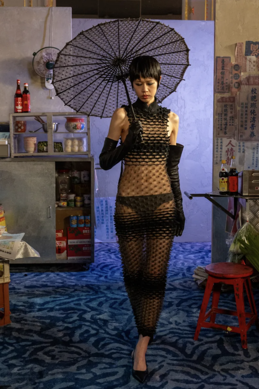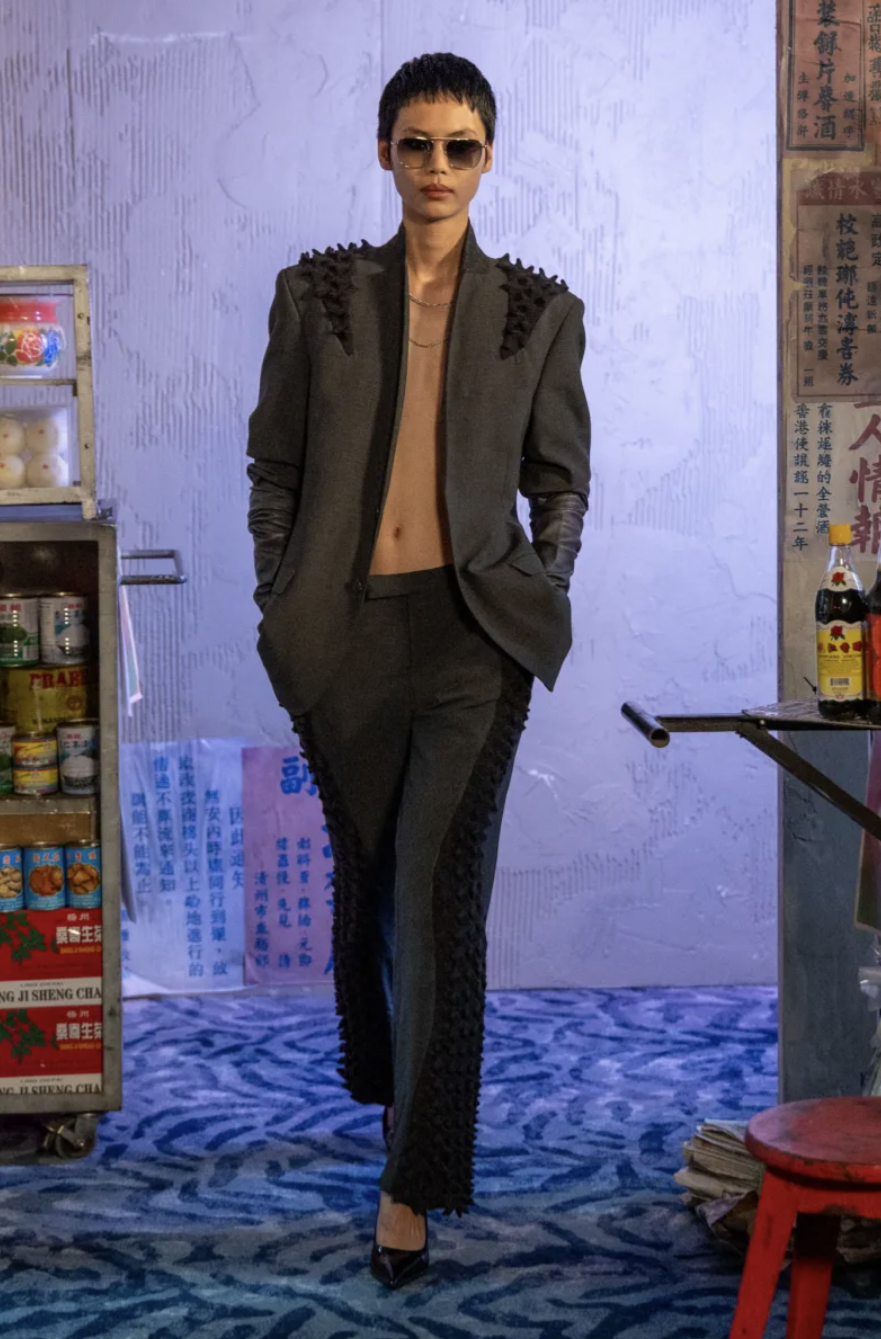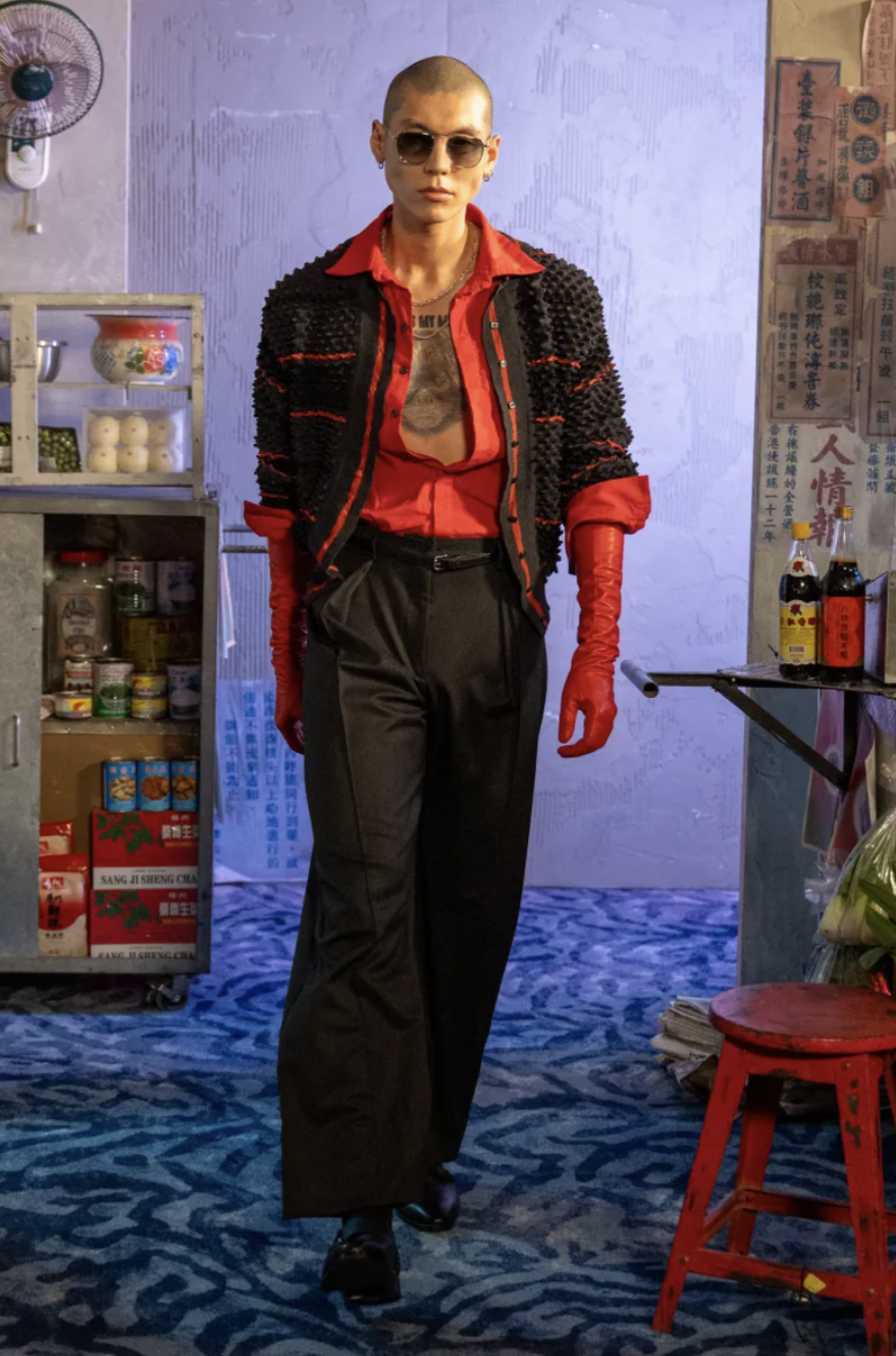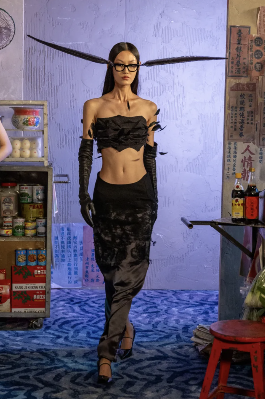 Lo’s signature spiked knits appeared more sensual and self-assured than ever, less armour and more declaration. Emerald and vermilion tones evoked neon reflections on wet city pavements, while sheer panels and sculptural tailoring added flashes of modern sensuality. Pieces inspired by Peking opera, including extravagant eyewear designed in collaboration with Cubitts, paid homage to theatrical beauty while amplifying the playfulness that defines Lo’s aesthetic. Every detail pulsed with the rhythm of Hong Kong after dark — frenetic, layered and alive.
