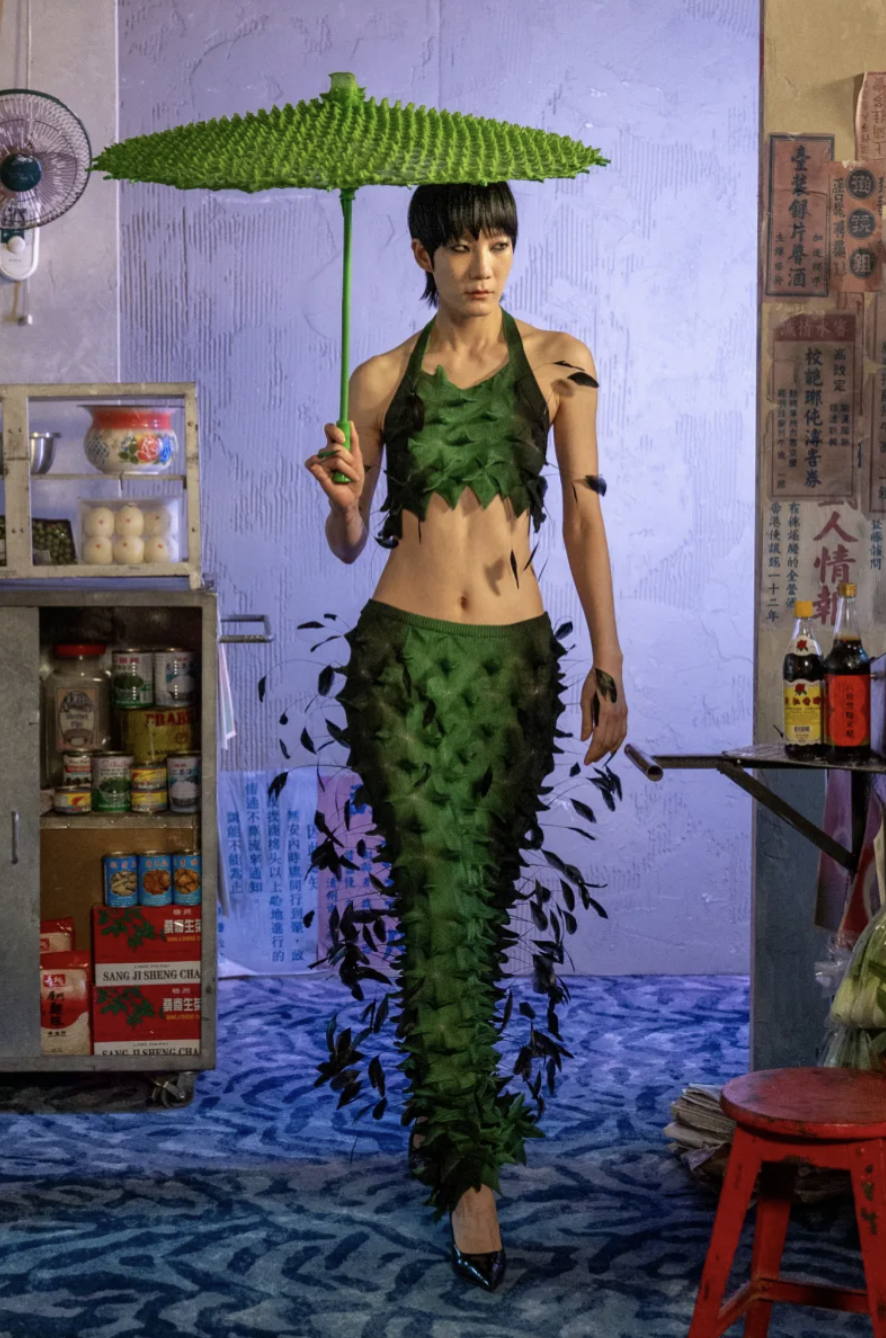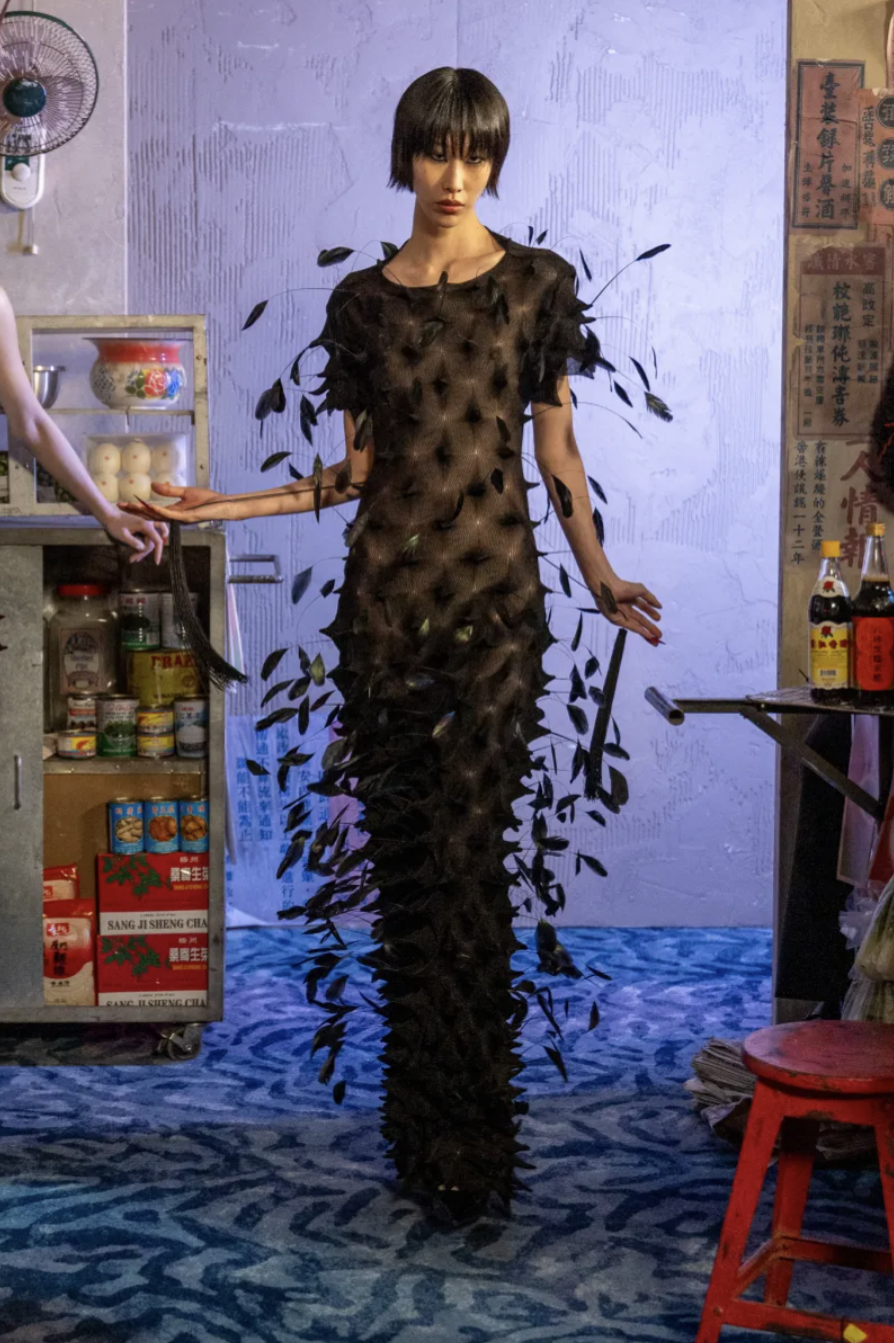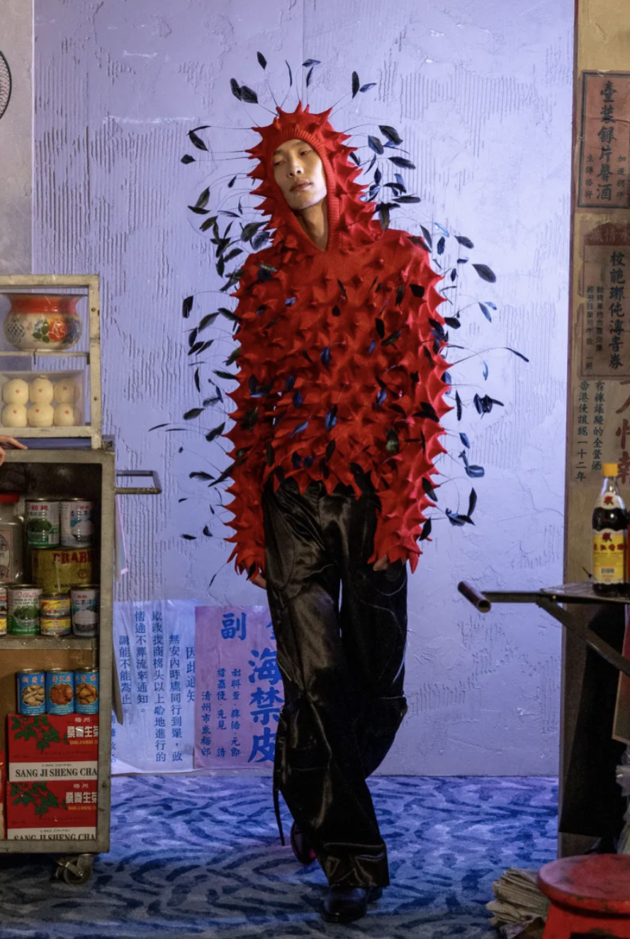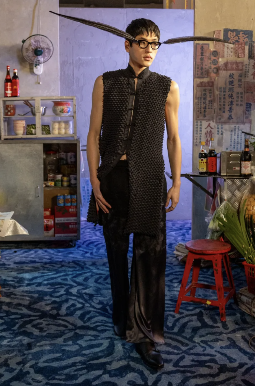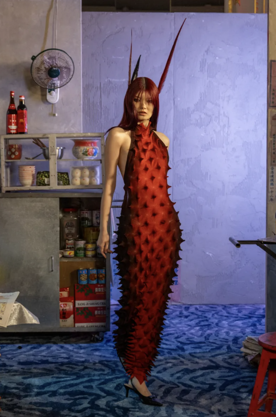 Lo’s signature spiked knits appeared more sensual and self-assured than ever, less armour and more declaration. Emerald and vermilion tones evoked neon reflections on wet city pavements, while sheer panels and sculptural tailoring added flashes of modern sensuality. Pieces inspired by Peking opera, including extravagant eyewear designed in collaboration with Cubitts, paid homage to theatrical beauty while amplifying the playfulness that defines Lo’s aesthetic. Every detail pulsed with the rhythm of Hong Kong after dark — frenetic, layered and alive.