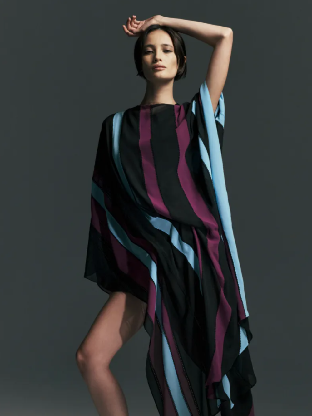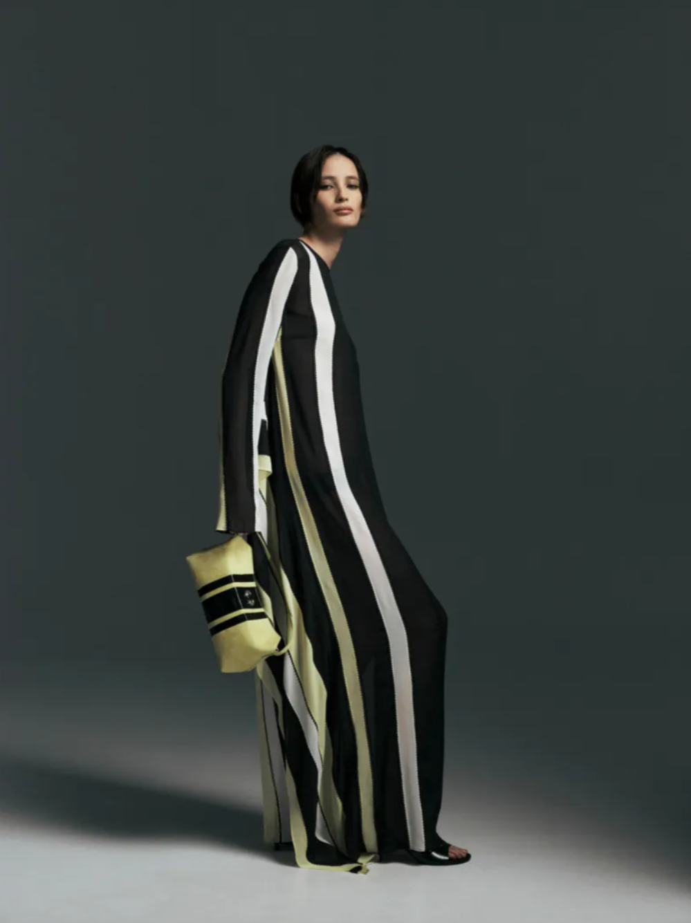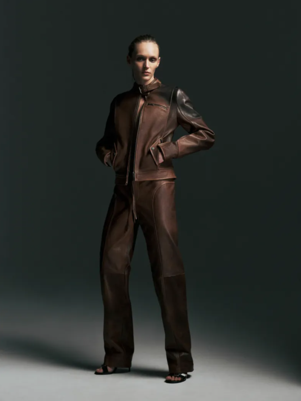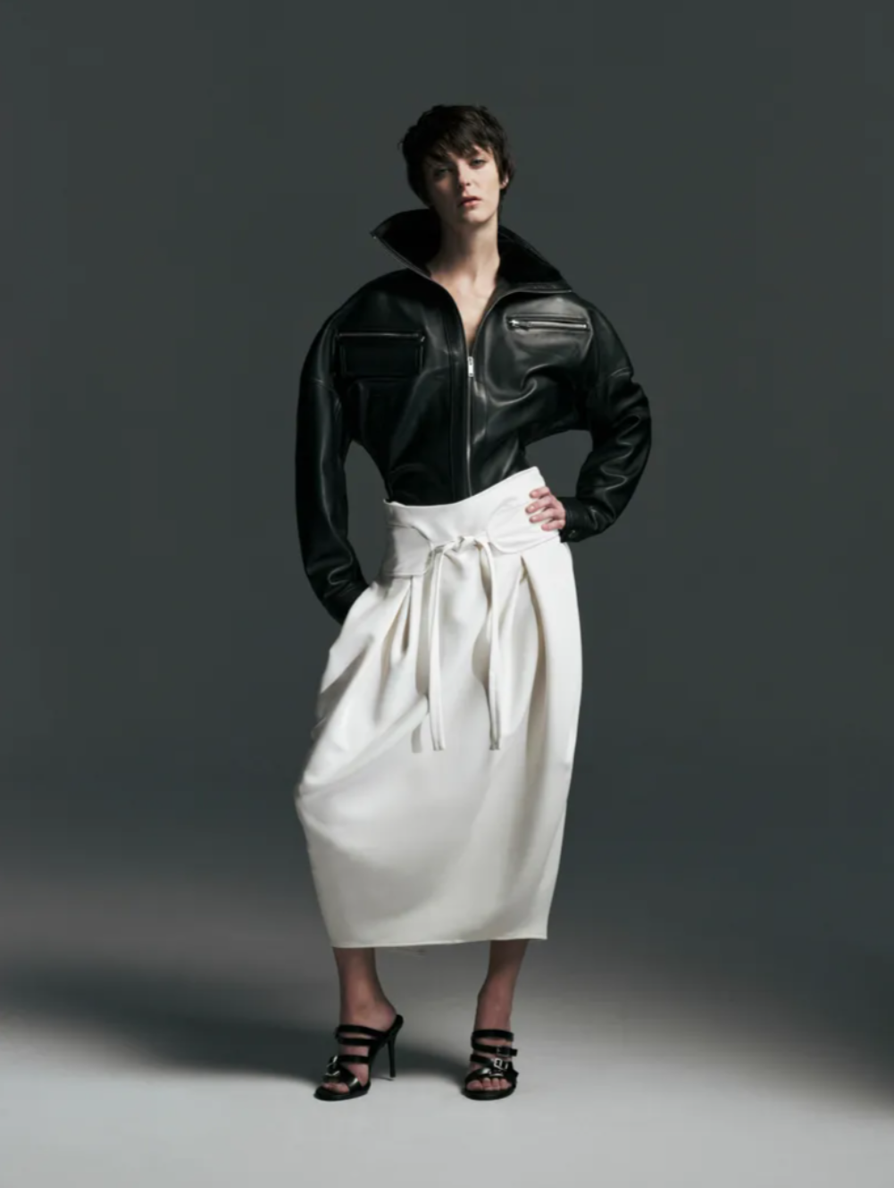 Automotive design also left a visible imprint on the Christopher Esber Fall 2026 collection. Racing inspired references appeared in striped patchwork dresses reminiscent of car livery, perforated detailing on pencil skirts and aerodynamic cut outs in fluid jersey dresses. Tailoring brought the concept back to the body, particularly a black blazer shaped with corset like seams that subtly articulated the silhouette. Leather jackets with shawl collars featured removable contrasting linings, sometimes left partly attached to create a slightly regal effect. Esber described his approach as ensuring every garment includes a small unexpected twist, just enough to make someone pause and look closer, a philosophy that defined the quietly provocative character of the Christopher Esber Fall Winter 2026 collection.