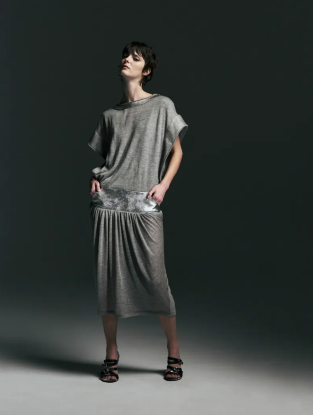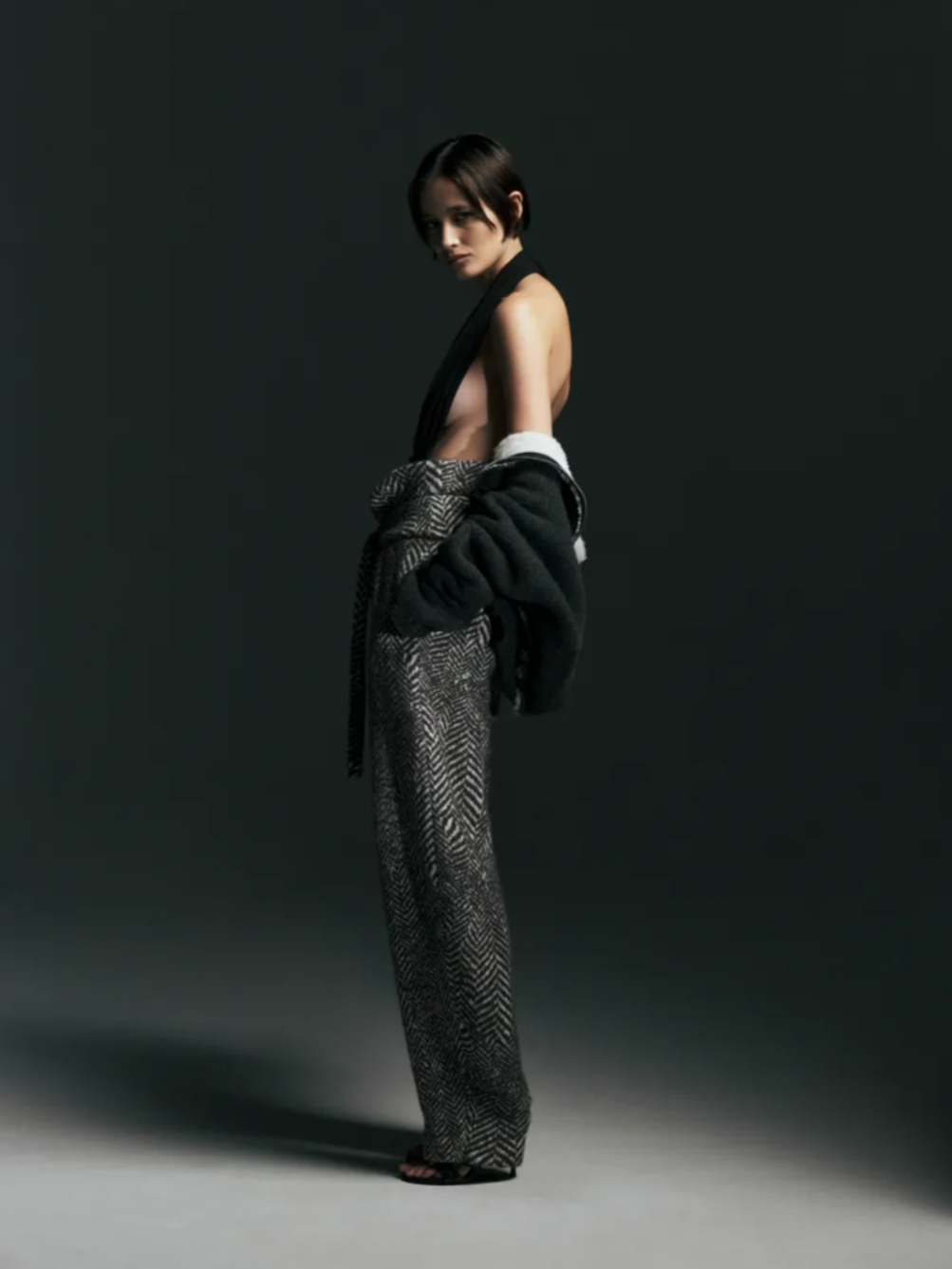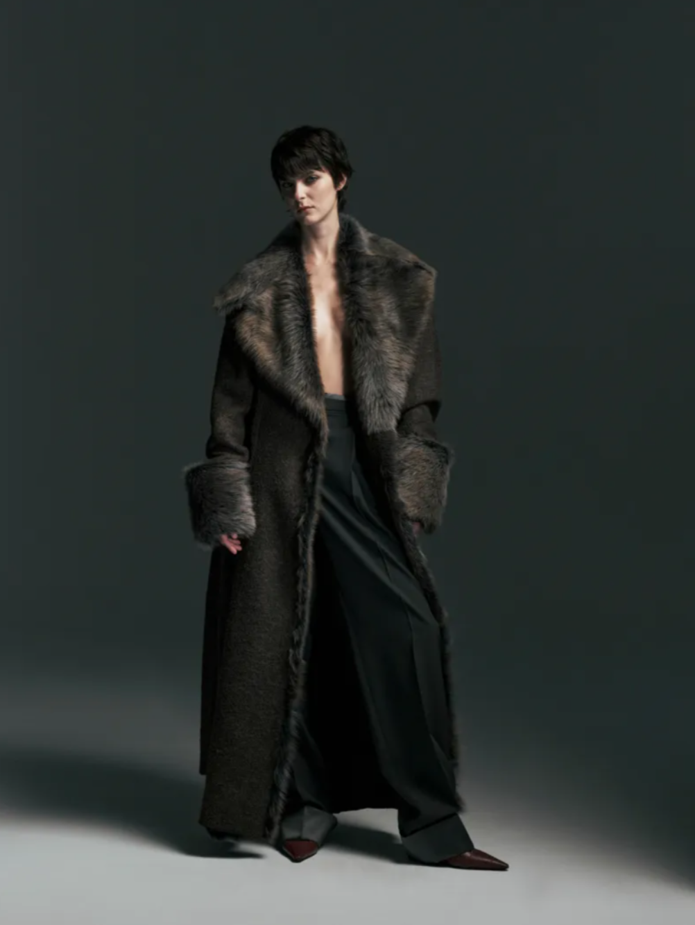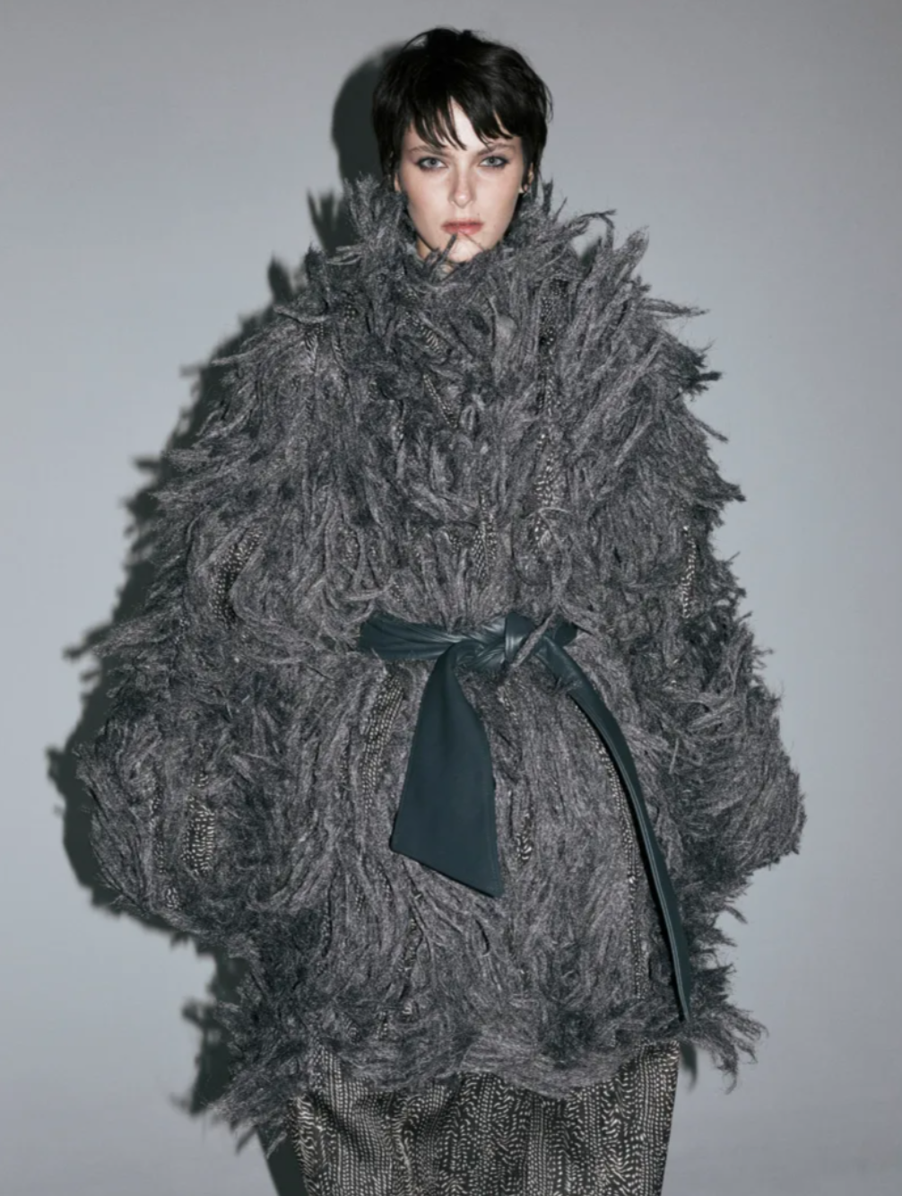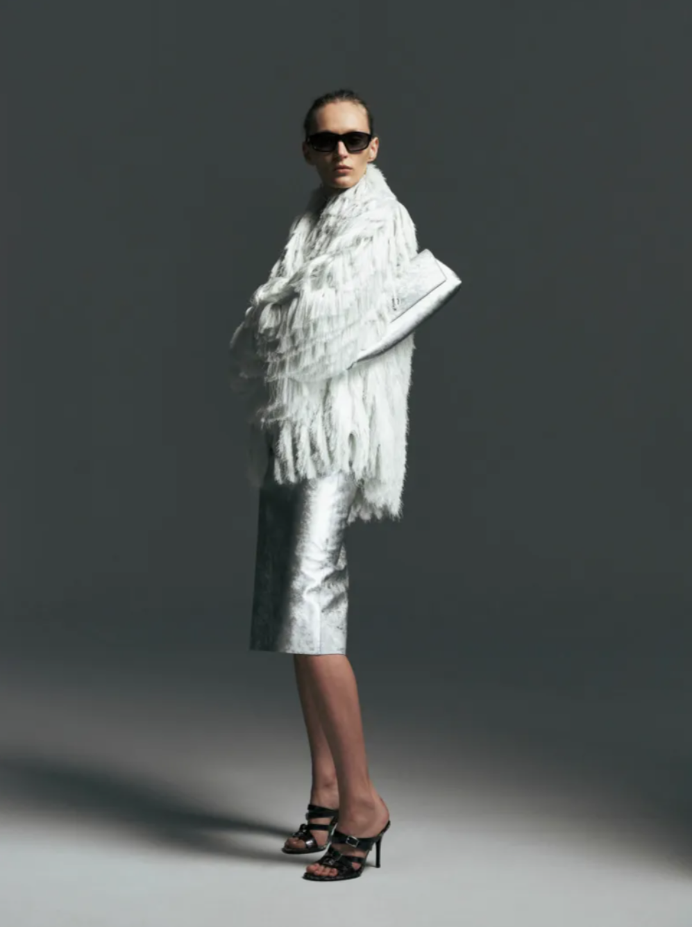 Throughout the Christopher Esber Fall Winter 2026 collection, rounded shapes suggested a sense of comfort and containment, echoing the feeling of being enclosed within a vehicle. Fabrics played a key role in conveying that mood. A thick corduroy carried the plush depth of fur without referencing it directly, while feathered silk georgette created marabout like fringes that cascaded across skirts and dresses, at times resembling a flurry of owl feathers in black and white. These textures introduced movement and softness within the Christopher Esber Fall 2026 lineup, balancing the sharper elements of the collection.