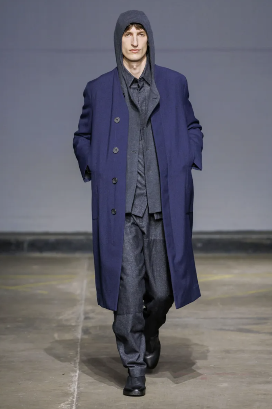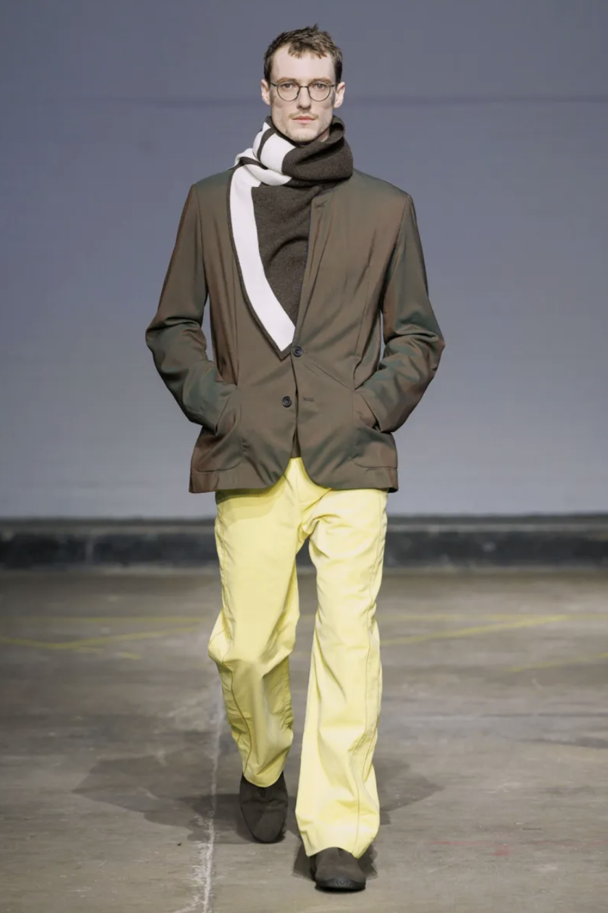 The tailoring itself was meticulous yet relaxed. Double-breasted suits and tuxedo jackets appeared in Japanese wool jersey, iridescent chambray and micro-corduroy, materials that softened the edges of formalwear without losing its precision. Squidgy overcoats and padded scarves were filled with ethically sourced duck feathers, balancing structure with comfort. The palette ranged from navy to golden yellow, the fabrics shifting subtly under the light, revealing depth and detail in every movement. Derrick described British tailoring as “armour,” but his take was breathable, tactile and alive — the antithesis of rigidity.