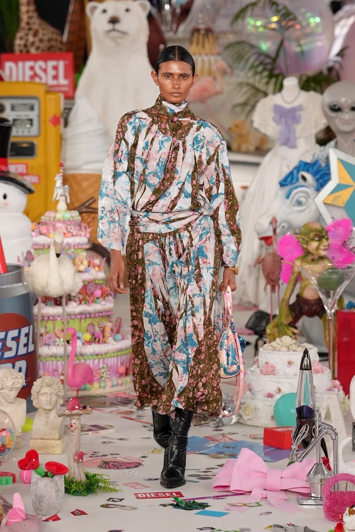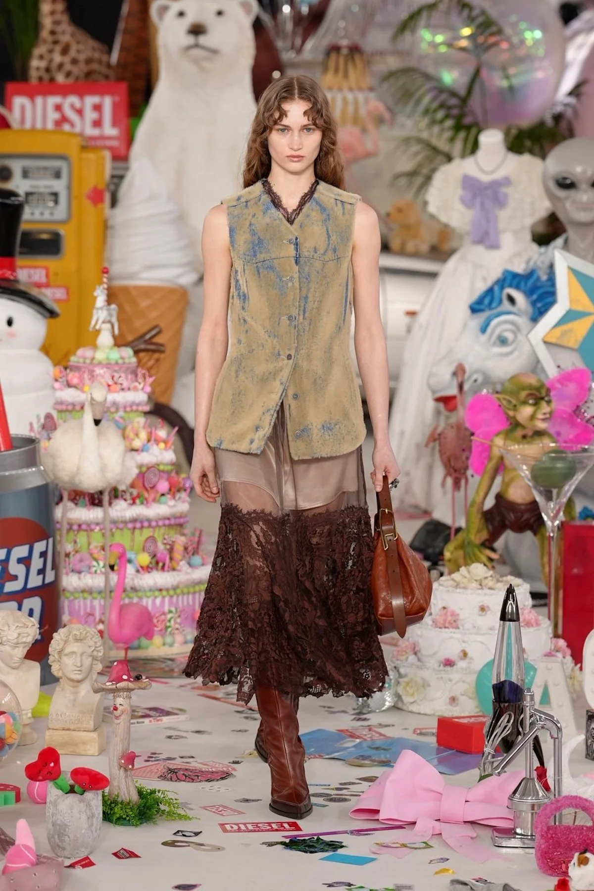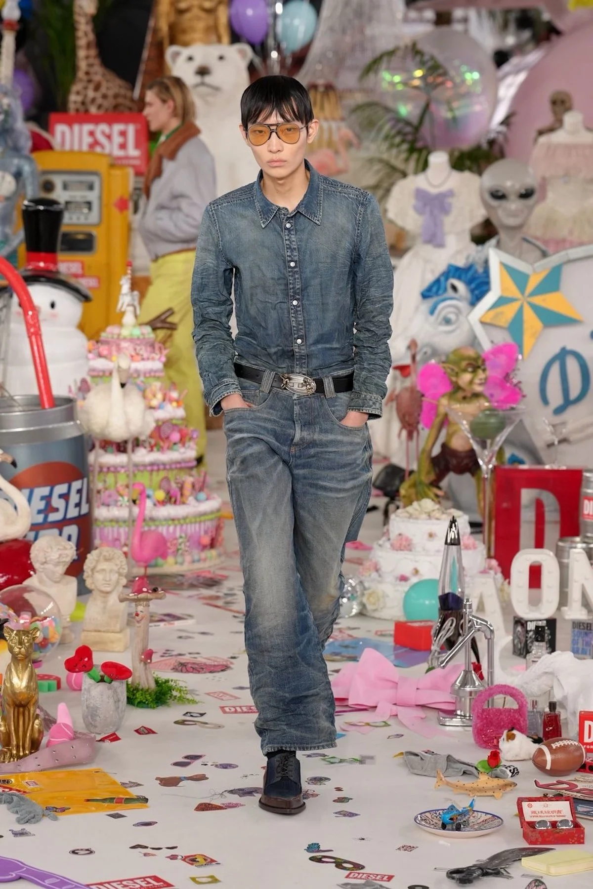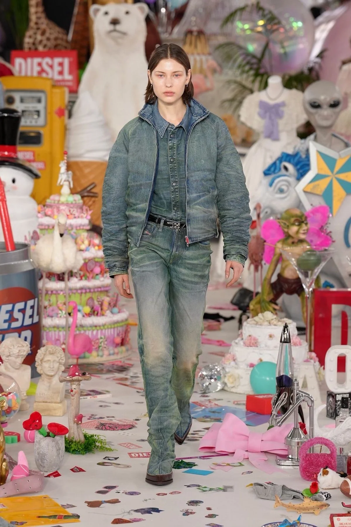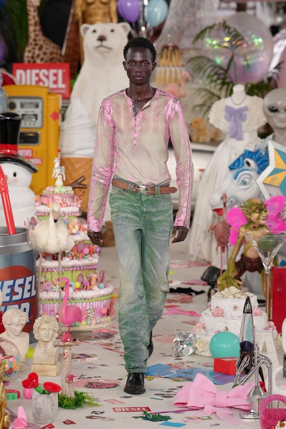 The set itself became part of the show’s storytelling. Over 50,000 objects from Diesel’s archives and offices worldwide were arranged in the center of the space, including inflatable dolls, Santa figurines, branded underwear, plush animals, sex toys, balloons, confetti, and even pizza slices. Each object carried a story, inviting guests to pick favorites and imagine the chaos behind them. The effect was immersive and exuberant, a reminder that fun, like shame or beauty, is subjective. Martens’ Diesel is alive, irreverent, and insistently human, a world where messiness is not a flaw but a feature.