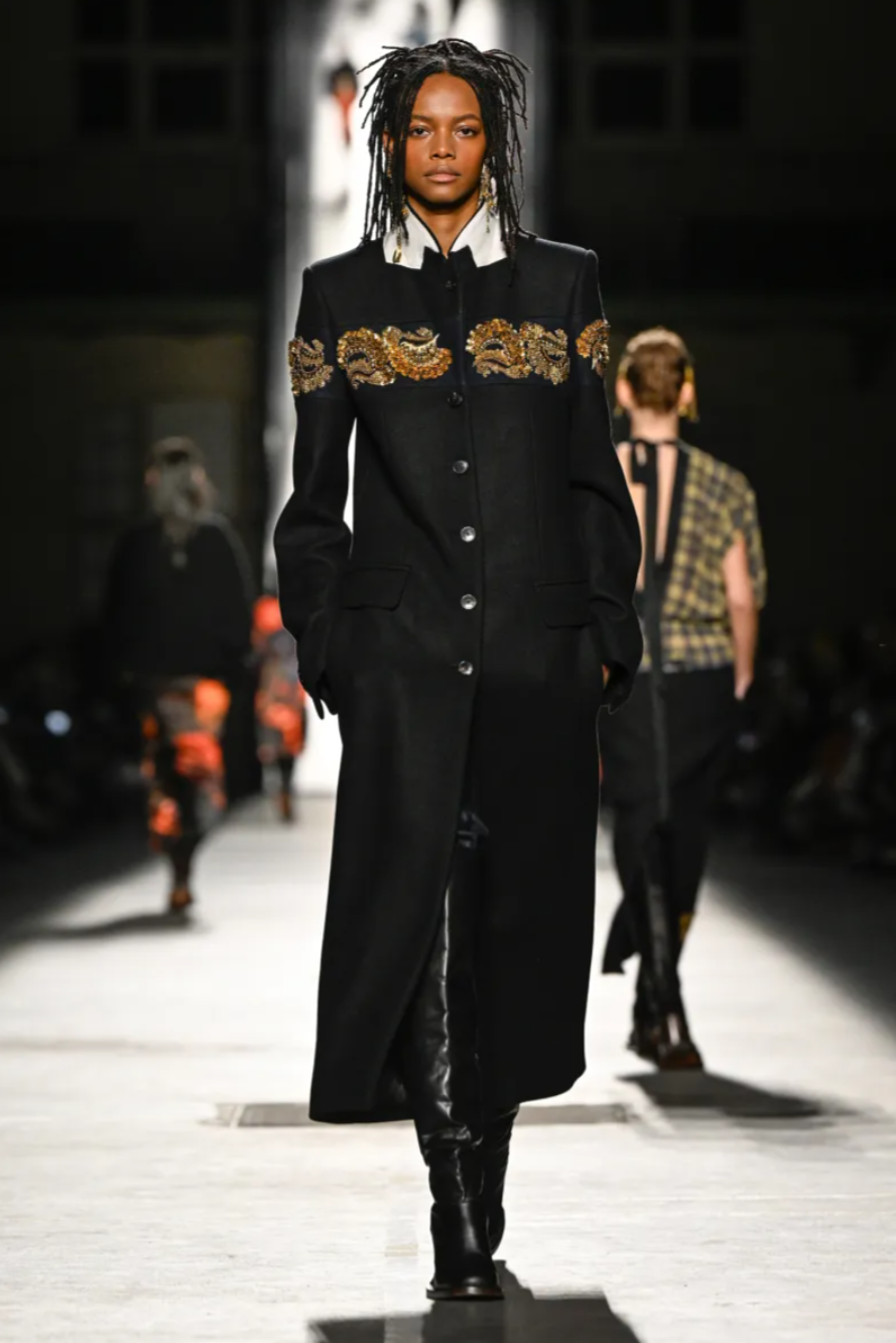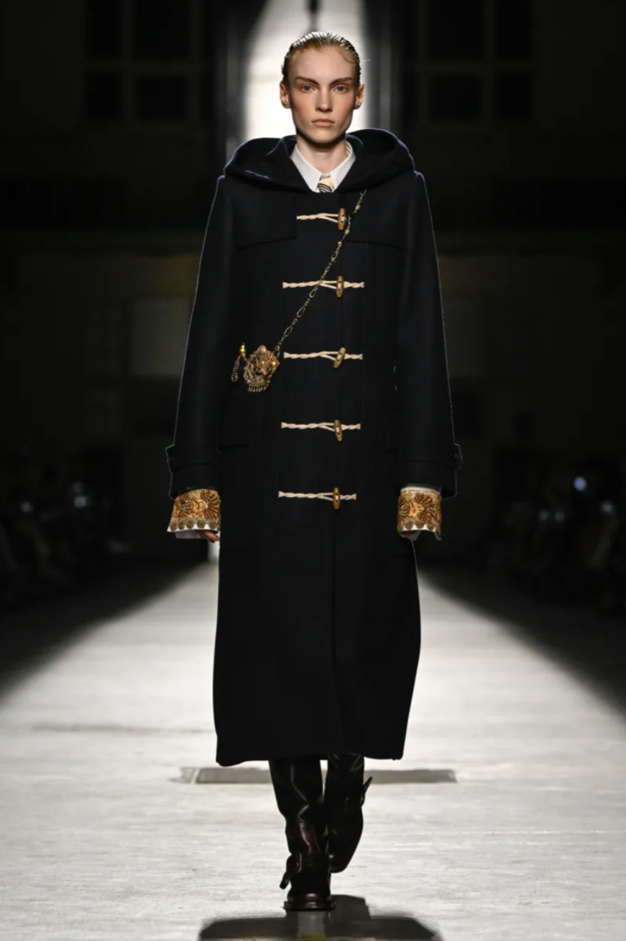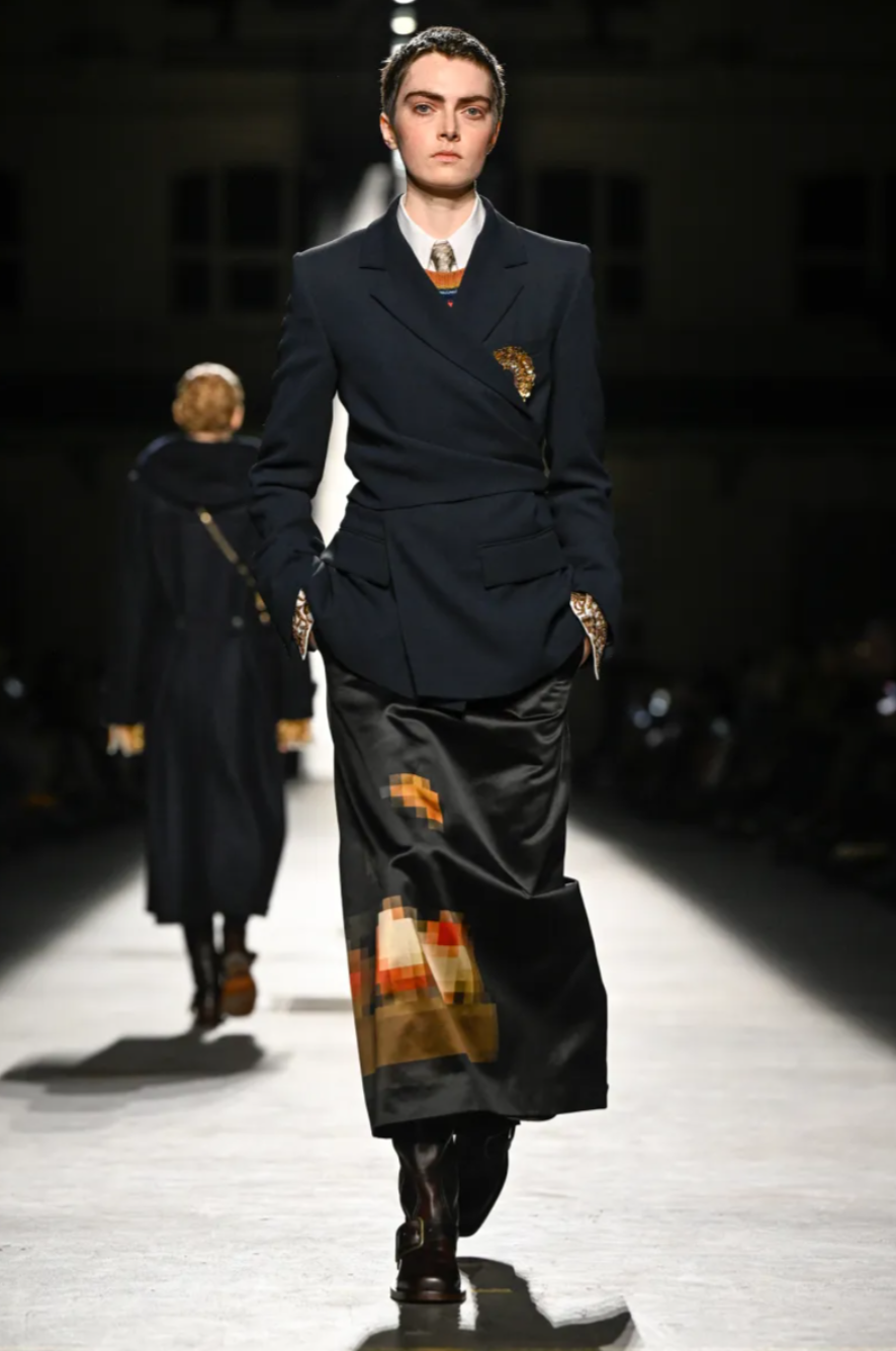 Despite the multitude of references, patterns, and colors, Klausner managed to unify the collection into a coherent, exuberant tapestry. Each look carried a sense of intentionality, balancing exuberant maximalism with precise tailoring and thoughtful composition. What could have felt chaotic instead felt deliberate, a whimsical yet sophisticated exploration of storytelling through fashion that showcased Dries Van Noten’s signature ability to harmonize artistry and wearability.