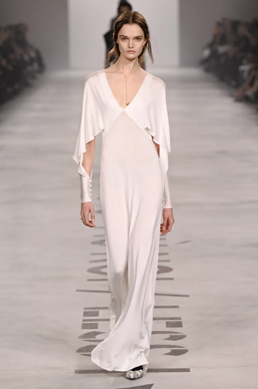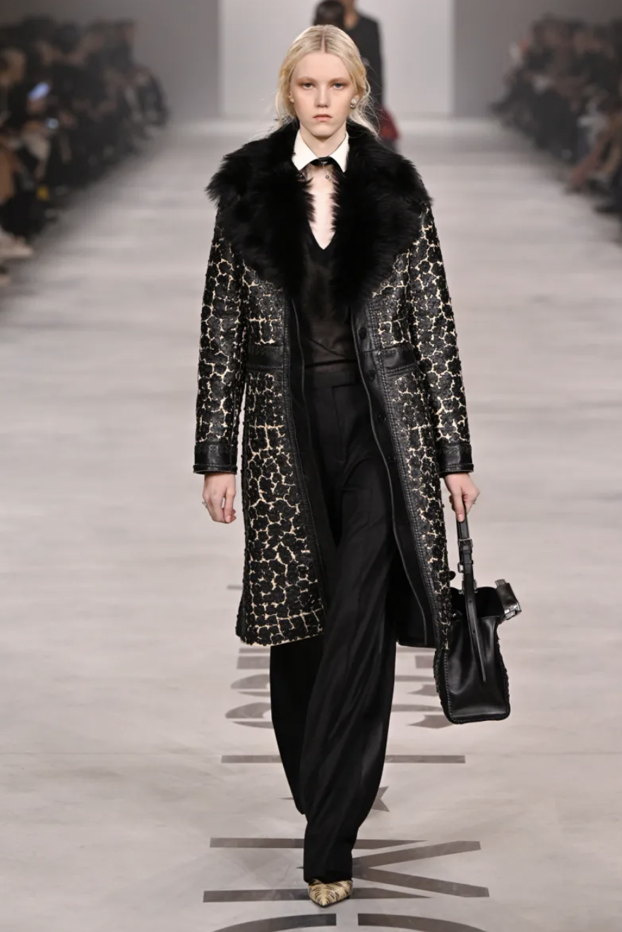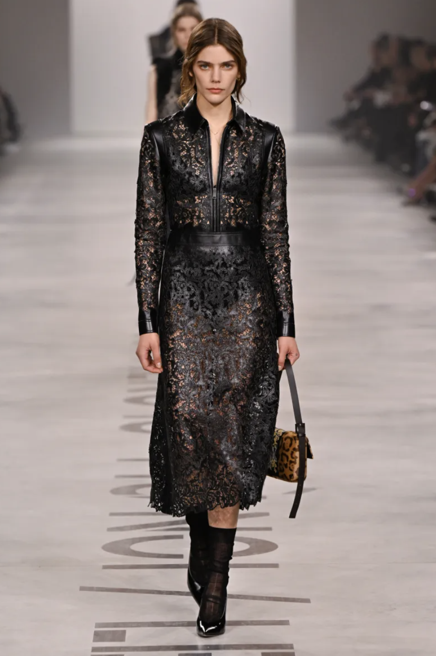 The collection stripped away nearly all Fendi logomania, instead embracing a predominantly monochromatic palette: black and grey accounted for roughly three-quarters of the looks. Amid this restraint, Chiuri inserted subtle points of texture and reference — folkloric fur-trimmed vests, a yellow-and-black motocross jacket, and an Army-green flight suit — while the bulk of the runway felt grounded, approachable, and meticulously tailored. Wool coats, pleated skirts, delicate lace dresses, and velvet evening columns anchored the 80-look lineup, with subtle nods to Fendi’s heritage through leather collars and cross-strap closures that recalled Karl Lagerfeld and Kim Jones.