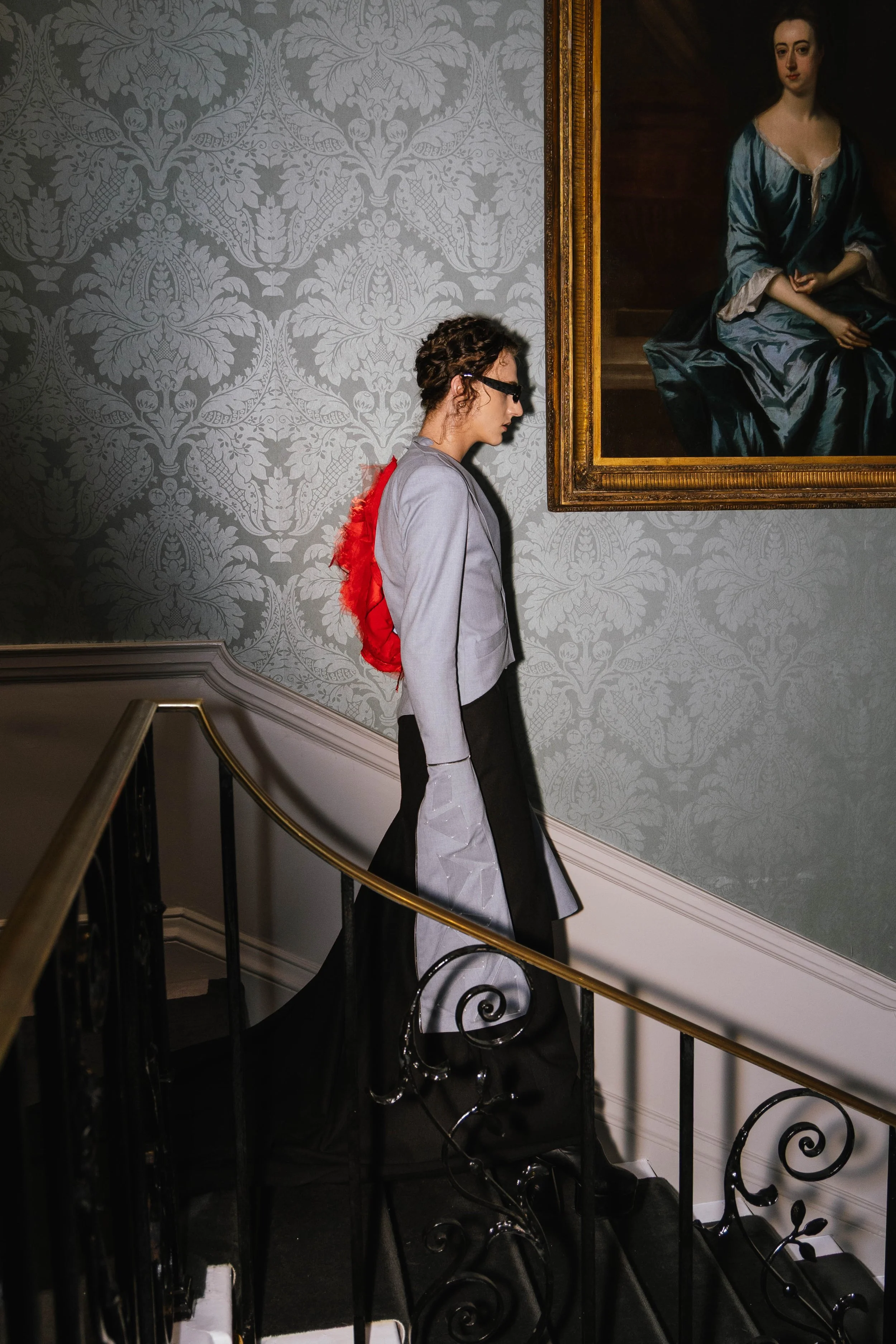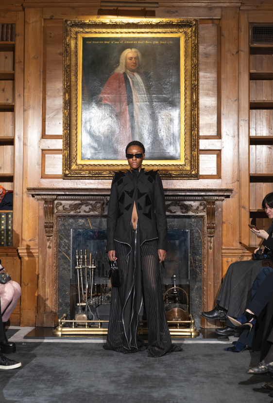 A Glass to Break is a collection that navigates the space between delicacy and force, tradition and modern rebellion. Through thoughtful tailoring, innovative materials, and sculptural accessories, Rivas explored the act of rebuilding from broken forms while maintaining a cohesive aesthetic. It continues the designer’s trajectory of purpose-driven, technically sophisticated fashion, following the critical acclaim of his SS26 presentation, A Feast for Crows, and signals his growing presence in both sustainable practice and conceptual runway storytelling.