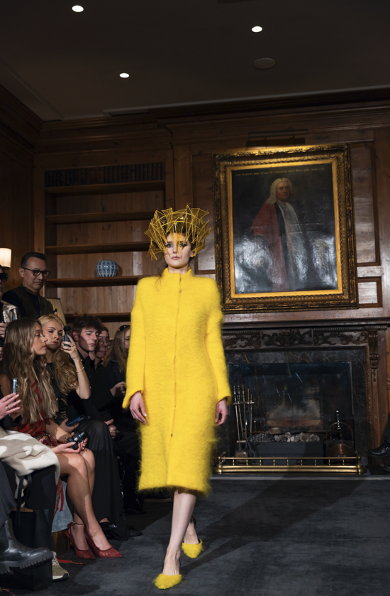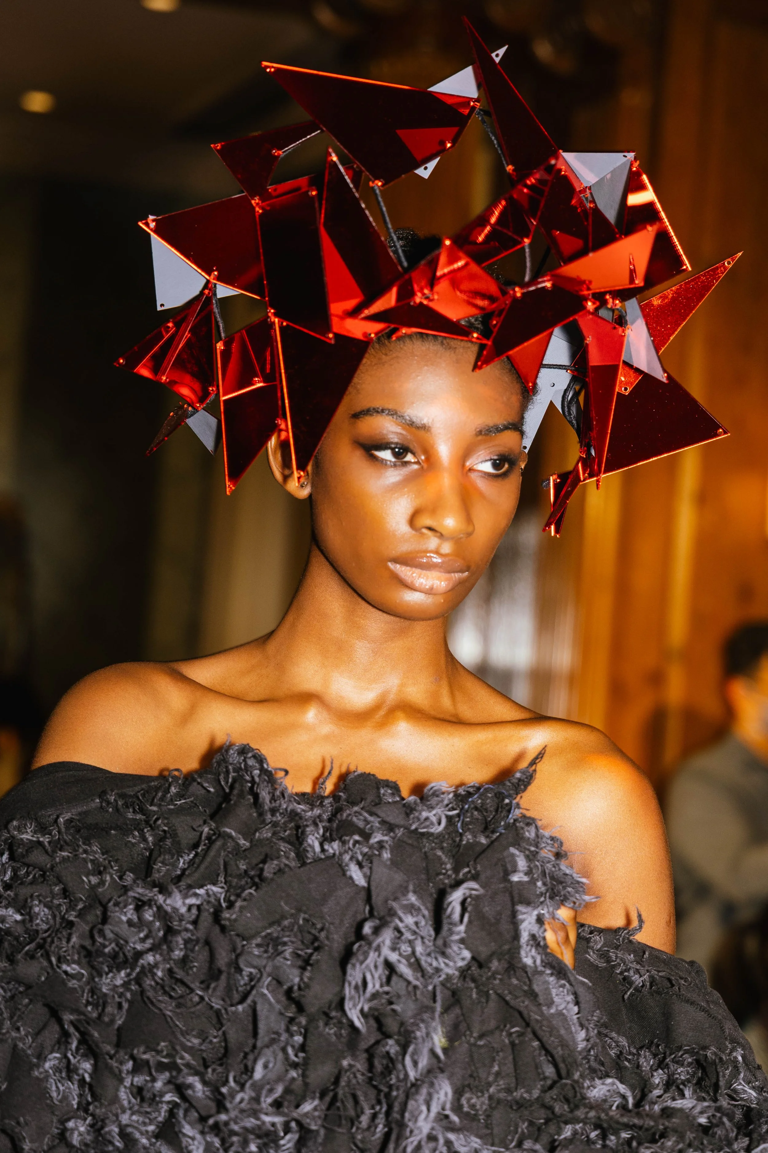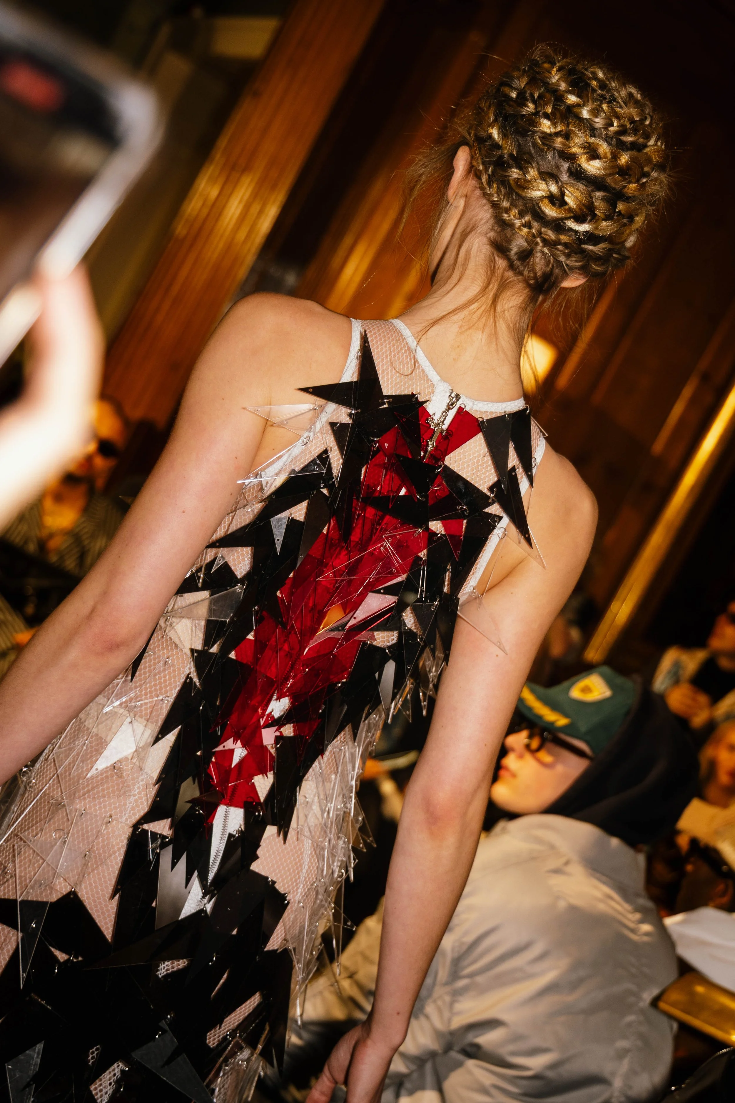 Several pieces stood out for their technical execution. A leather-panelled dress exemplified the collection’s balance between precision and wearability: the fit, flow, and silhouette were flawless, avoiding the extremes of ill-fitting or overtly fetishized leather designs. Within a largely muted color palette, a fuzzy yellow coat and matching sculptural headpiece brought a rare burst of energy, transforming the model into a living, slightly surreal sculpture. Another highlight was a dress composed of large, glass-like blocks meticulously beaded onto the fabric, a labor-intensive construction that underscored Rivas’ commitment to craft and detail.