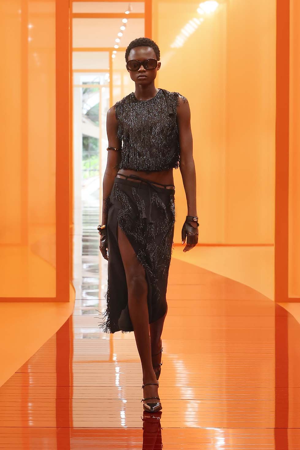 Tailoring was a key focus of the collection, with low-slung trousers and structured jackets blending masculine and feminine elements. The color palette was reminiscent of a fading summer sunset, moving from soft grays and greens to deep reds and vibrant orange. De Sarno’s 1960s influences were clear in the sleek, A-line skirts and grand coats, while sheer lace dresses added an element of seduction to the polished looks, striking the perfect balance between sophistication and sensuality.