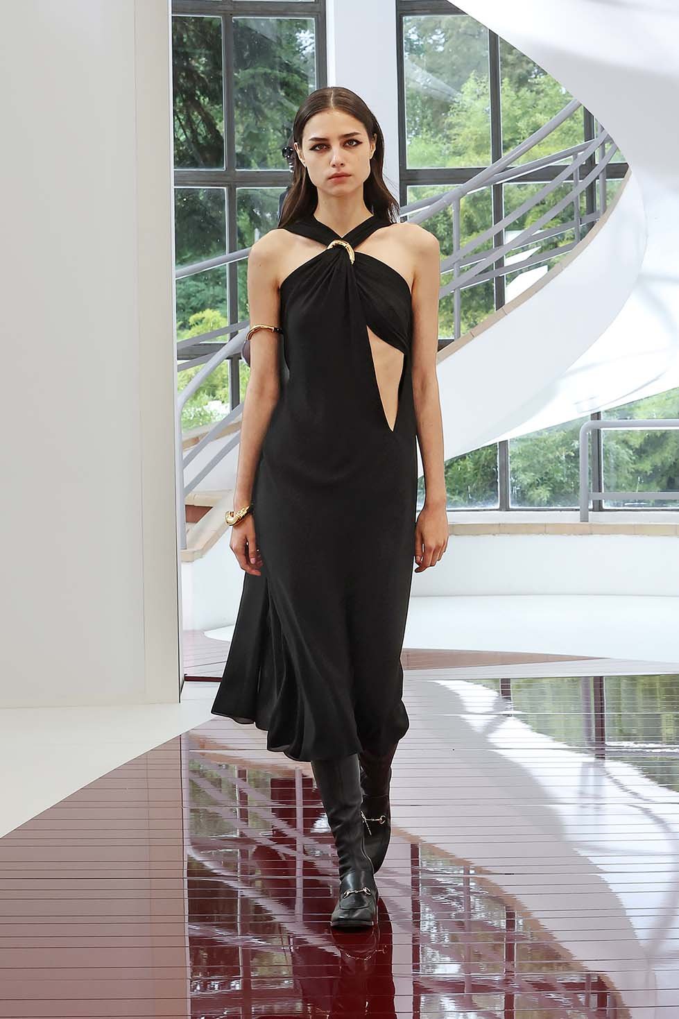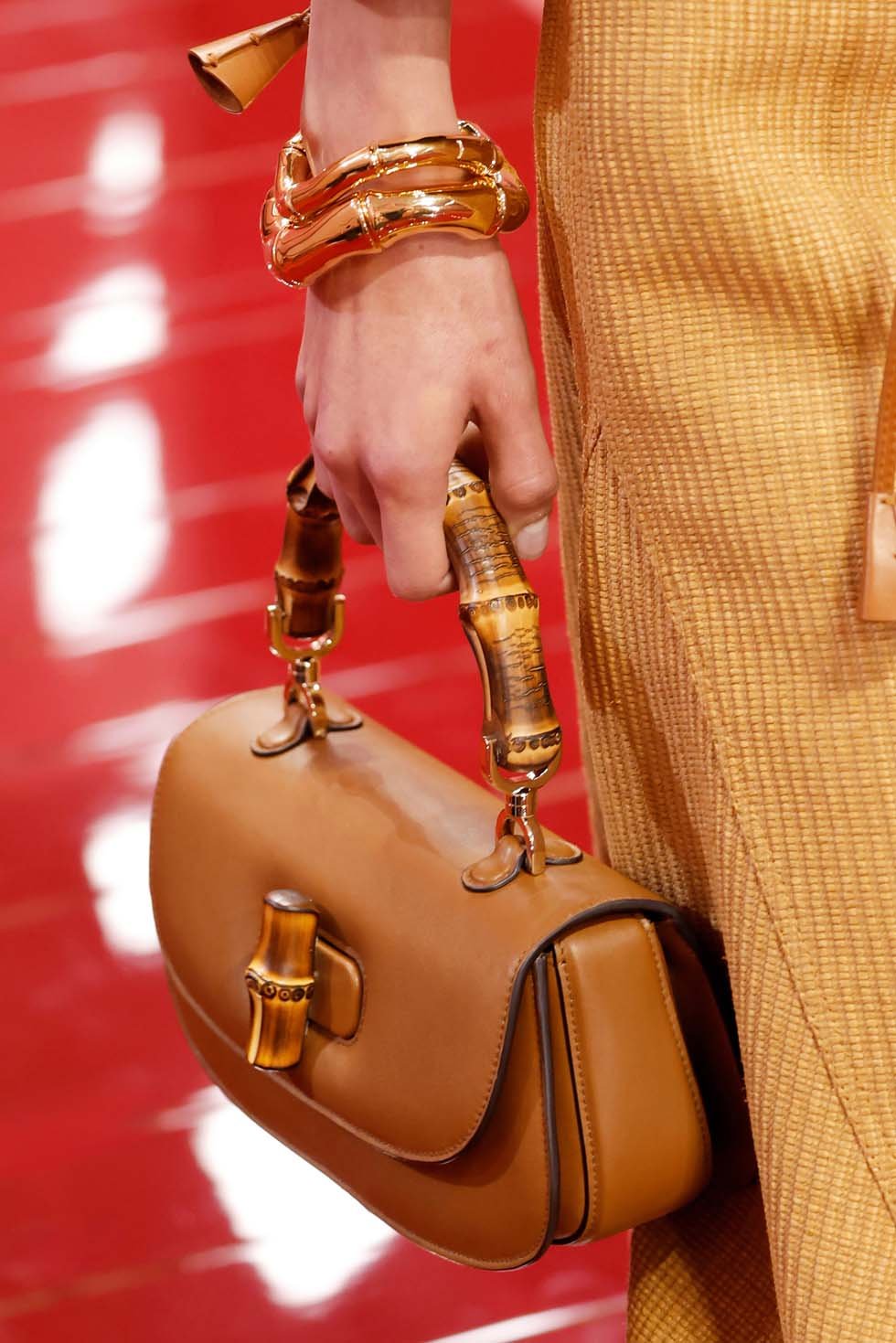 Gucci’s iconic heritage was ever-present, particularly through accessories. The Gucci Bamboo 1947 bag was reinterpreted with modern details, including a special collaboration with Japanese artists. Bamboo also inspired the jewellery, with sculptural bracelets and chokers weaving around the models’ arms and necks. De Sarno debuted the new Gucci Go bag, a compact and structured piece, while the Horsebit motif evolved across shoes, appearing on everything from classic loafers to platforms and ankle boots.