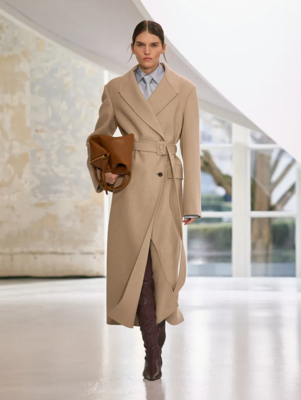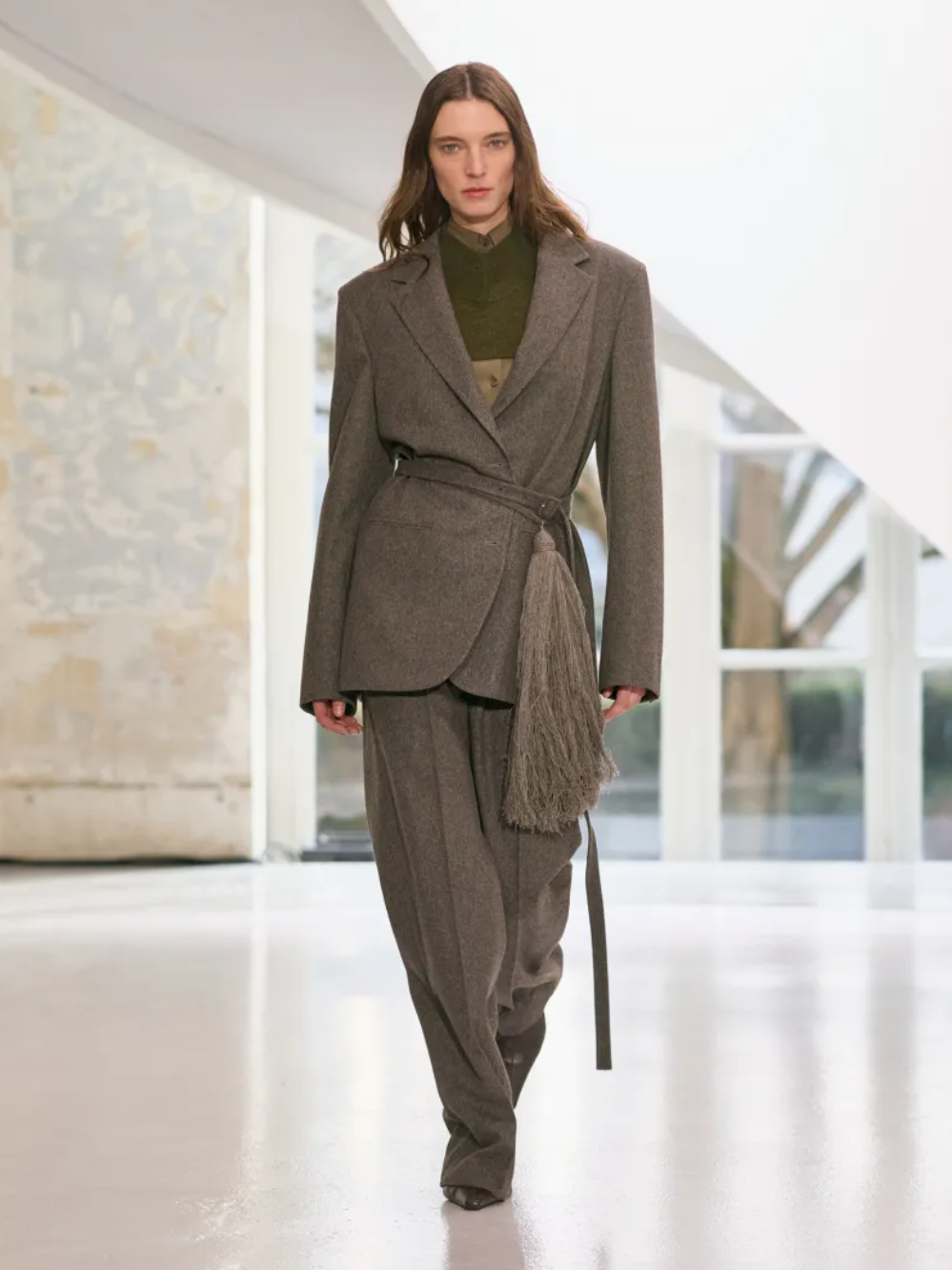 The fabrics themselves carried much of the narrative. Soft wools and cashmere created dense, protective volumes, forming sculptural silhouettes that seemed to fall naturally around the body. Silks introduced a lighter rhythm, gathered and twisted so they rippled like slow water, while satin appeared between layers with a subtle gleam, illuminating the depth of heavier folds. The palette remained grounded and thoughtful, moving through raven black, ink blue, oyster grey, and earthy browns, punctuated occasionally by moss greens and flashes of red. Balloon skirts curved gently at the hem, and clever loops at the waist and shoulders allowed the garments to shift shape as the body moved.