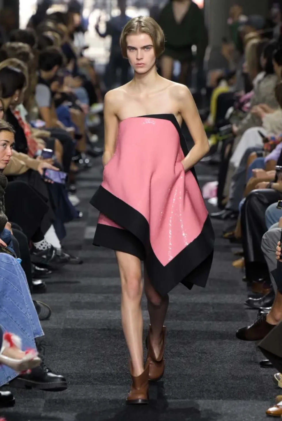 Anderson’s interpretation of femininity came through in an unexpected color palette. Saccharine pink sequin minidresses and architectural hemlines on negligee-like dresses dominated the runway, giving girlish hues an edge. The boldness extended to stiff leather skirts—tough, tutu-inspired shapes that veered dangerously close to avant-garde. There was a clear throughline to the brand’s famed accessories here, with the fabrications of JW Anderson’s cult handbags informing the collection’s structural choices. Leather was more than just an accessory—it became the star material, central to Anderson’s vision for the season.