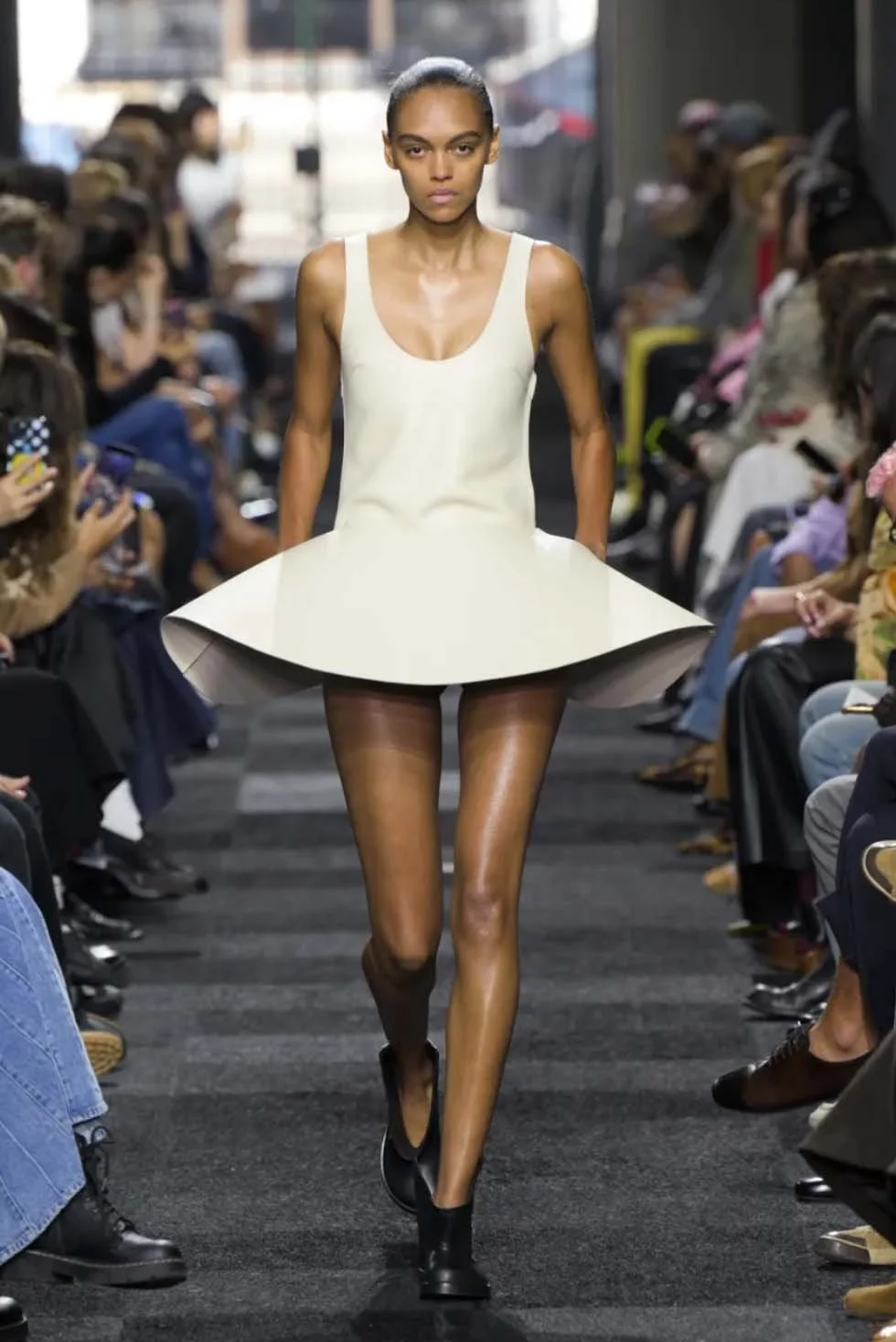 Speaking of materials, Anderson’s deep dive into materiality was perhaps the most impressive aspect of this collection. Leather, silk, and cashmere formed the bedrock of the SS25 lineup. The exploration of these fabrics led to a tactile feast, where the unexpected met the familiar in surprising ways. 3D-printed trompe l’oeil effects turned silk minidresses into faux knits, and wool strips were woven into dresses that appeared ready to take flight. These were clothes that demanded a second look, a closer examination to fully grasp their complexity. It was as if each piece held its own little secret—a detail or a fabrication twist that only revealed itself upon careful observation.