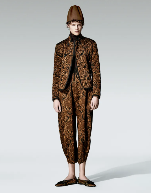 The presentation deepened the narrative. Guests walked through corridors lined with blurred train windows before stepping into a paisley-clad waiting room filled with vintage Loro Piana suitcases and travel memorabilia. Mannequins stood in vignettes that recalled faraway places, from the English countryside to a Milanese soirée, each look defined by exquisite fabric and subtle color. A double-face cashmere robe coat, a rust suede coach jacket, and a pumpkin-hued cardigan embroidered with boiserie-like motifs stood out as quiet showstoppers. Nomadic Reverie reaffirmed Loro Piana’s mastery of tactile luxury, turning the act of dressing for travel into an art form and reminding us that true refinement moves as softly as a train at dusk.