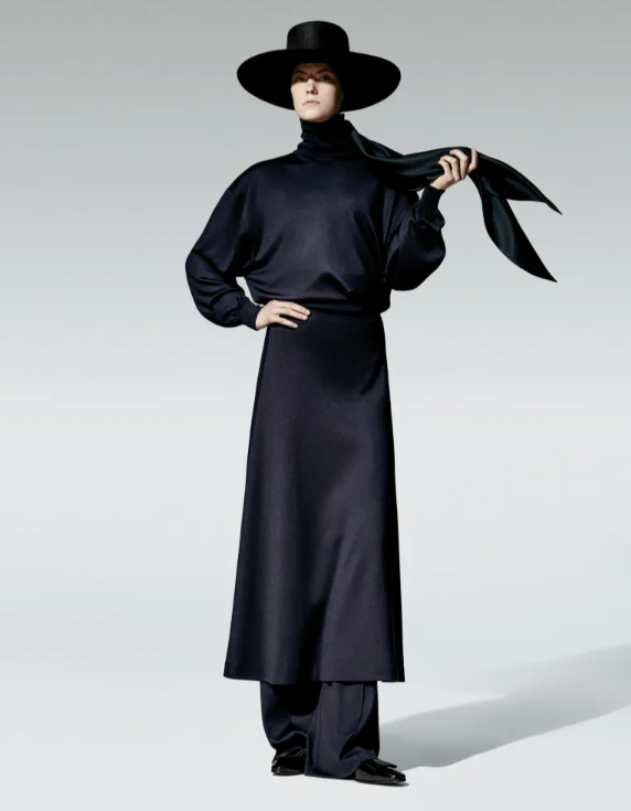 The silhouettes evoked motion and ease. Blazers and coats were tailored but fluid, their constructions soft enough to feel lived in. Loro Piana icons such as the Spagna, Horsey, Roadster, and Winter Voyager appeared in modern interpretations, while the Rovasenda and Maremma jackets took on bomber proportions. The women’s pieces hinted at a romantic practicality, with wrap coats, relaxed trousers, and long skirts layered over rollnecks. Menswear balanced precision and pragmatism with multi-pocket reporter jackets and cashmere tuxedos finished with shawl collars. The result was clothing that seemed assembled on the go, yet impeccable in every stitch, as if the traveler dressing en route had an instinct for elegance.