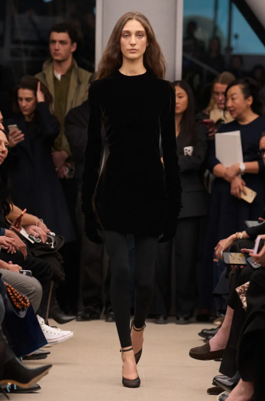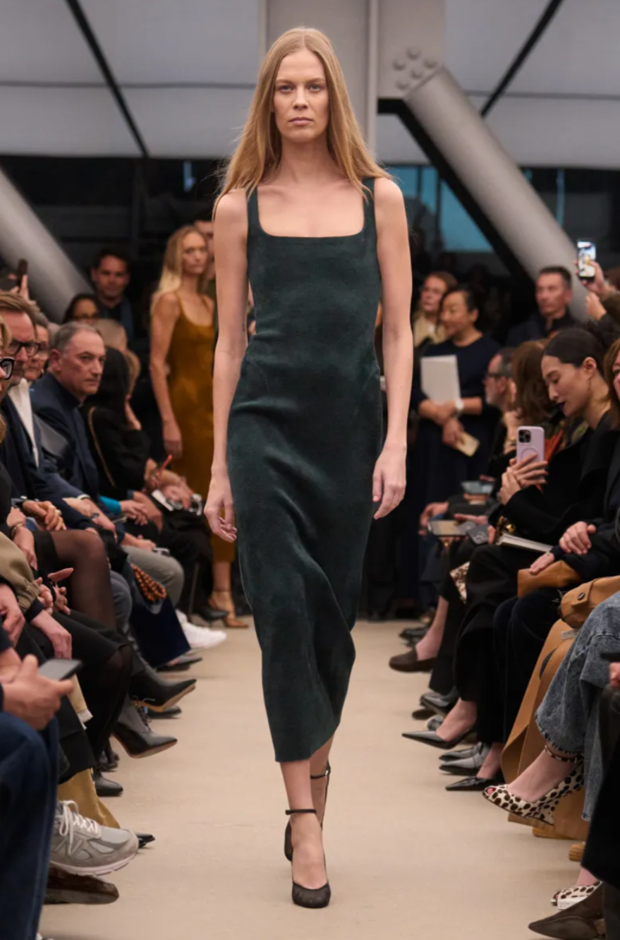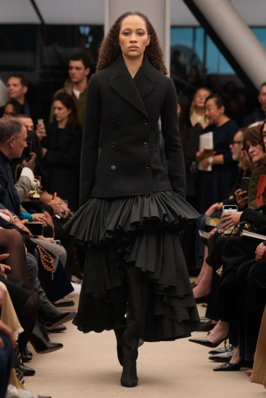 The collection opened with clingy tank dresses that traced the body with a sculptural clarity long associated with the house. Some referenced Alaïa’s archival crocodile tailcoats in subtle, ghostlike ways, while velvet suits hugged the figure with a controlled sensuality. Elsewhere, gently flared calfskin coats introduced a quiet sense of movement, building gradually toward the dramatic density of ruffled skirts that closed the show. The silhouettes were slender throughout, an elongated line that felt like both a summation of Mulier’s tenure and a carefully considered closing statement.