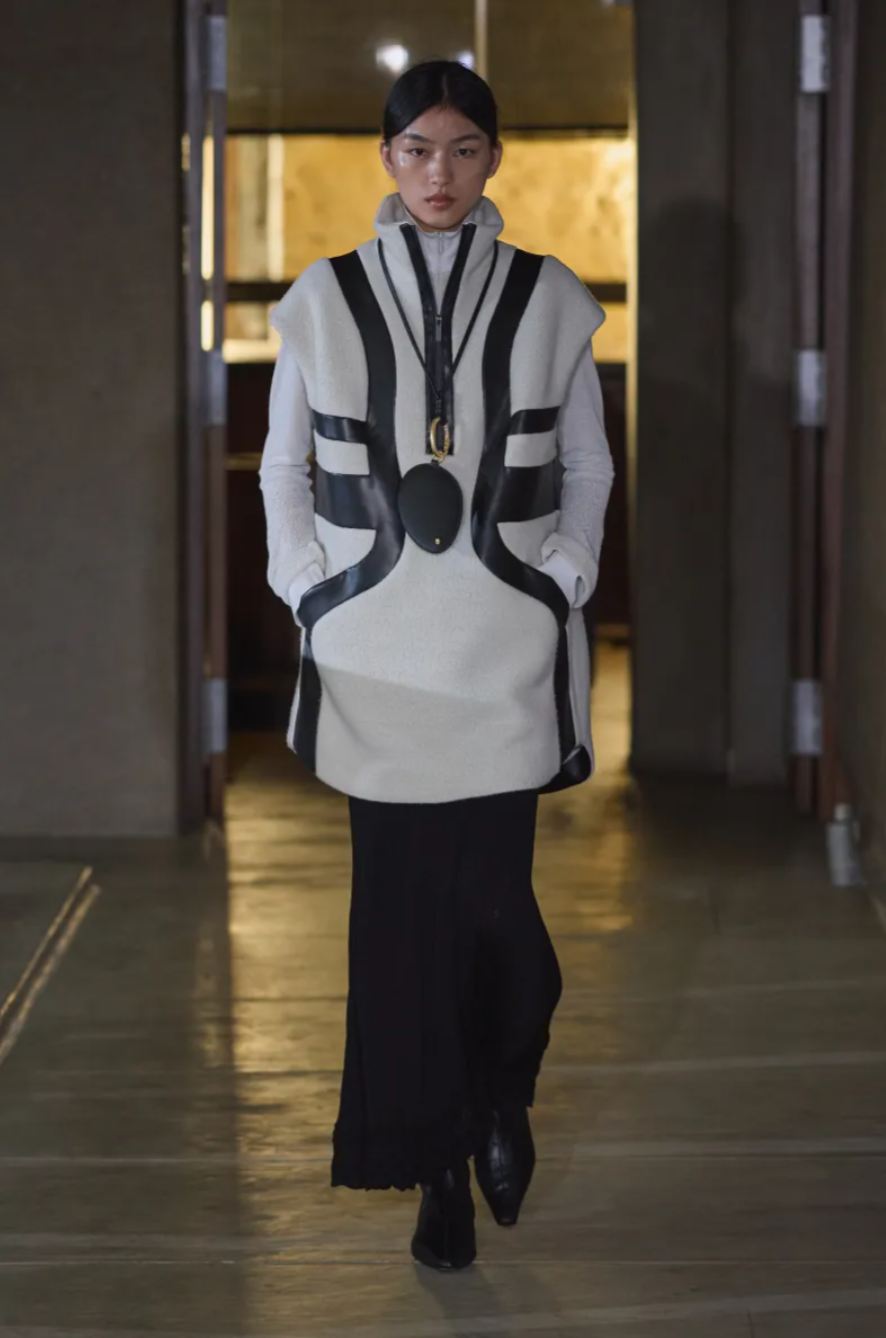 For Fall 2026, Kurogouchi drew inspiration from time spent between Tokyo and the mountainous region surrounding her hometown of Nagano. She described the collection’s silhouettes as “transparent landscapes,” an idea that translated into layered, translucent garments inspired by emerald pressed glass, shoji paper screens and windows glazed with morning frost. The pieces often appeared delicate but were built with intention. Sheer layers overlapped in soft gradients, knitwear ranged from fuzzy chimney neck sweaters to airy multi layer dresses, and tailoring appeared in long blazers with slightly relaxed shoulders that added an understated elegance.
