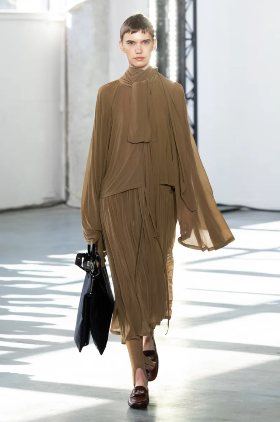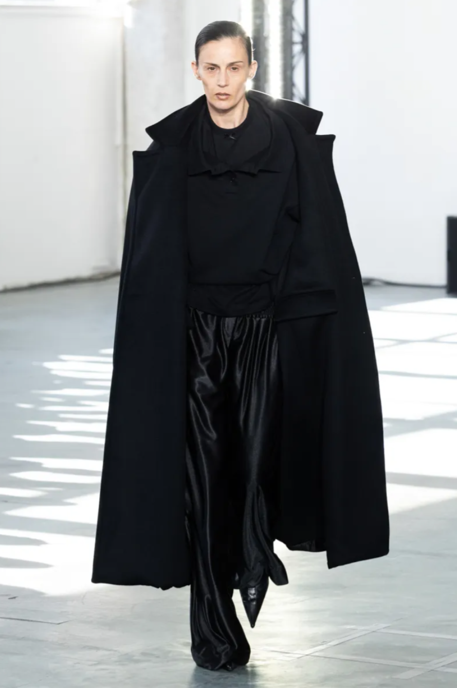 Silhouettes played with proportion and versatility. Boxy shift dresses widened at the shoulders before draping softly at the neck, subtly shifting the body’s shape without losing their simplicity. Knitted puffer jackets in bright red or metallic silver were so densely constructed they needed no padding, while many pieces could be worn inside out. A faux fur coat with a vivid pink satin lining raised the question of which side was meant to face the world, leaving the final decision to the wearer.