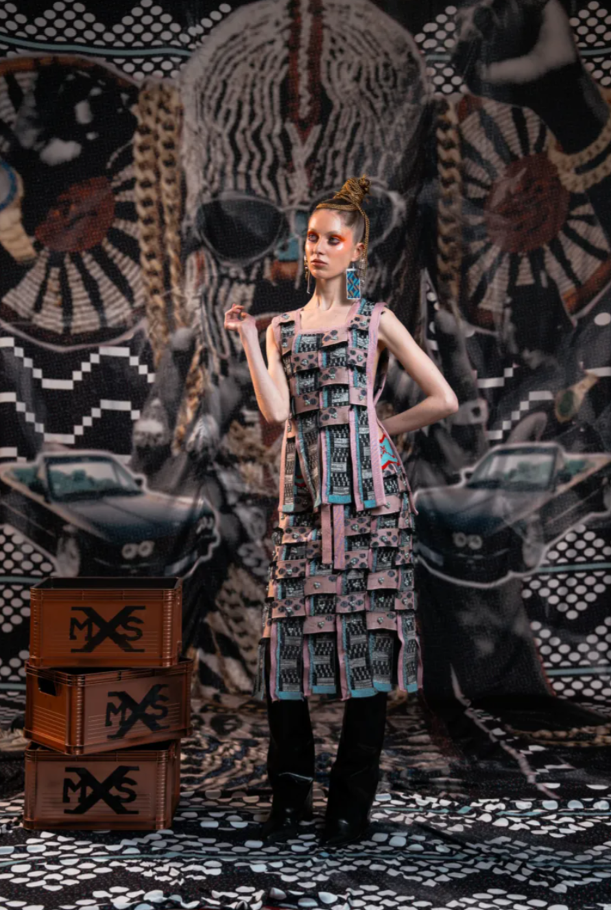 Presented inside the Paris incubator space Philanthro-Lab, the collection unfolded as a vivid display of colour and symbolism. Maxhosa’s signature knitwear appeared across relaxed polo shirts, velour tracksuits and sculptural dresses composed of interwoven knitted bands, each piece carrying motifs rooted in Xhosa visual culture. This season, however, Ngxokolo widened the visual vocabulary, incorporating hieroglyphic inspired graphics and references to broader African iconography, including national flags such as those of Nigeria. The result felt expansive rather than nostalgic, a reminder that African design is not a static archive but a living, evolving language.