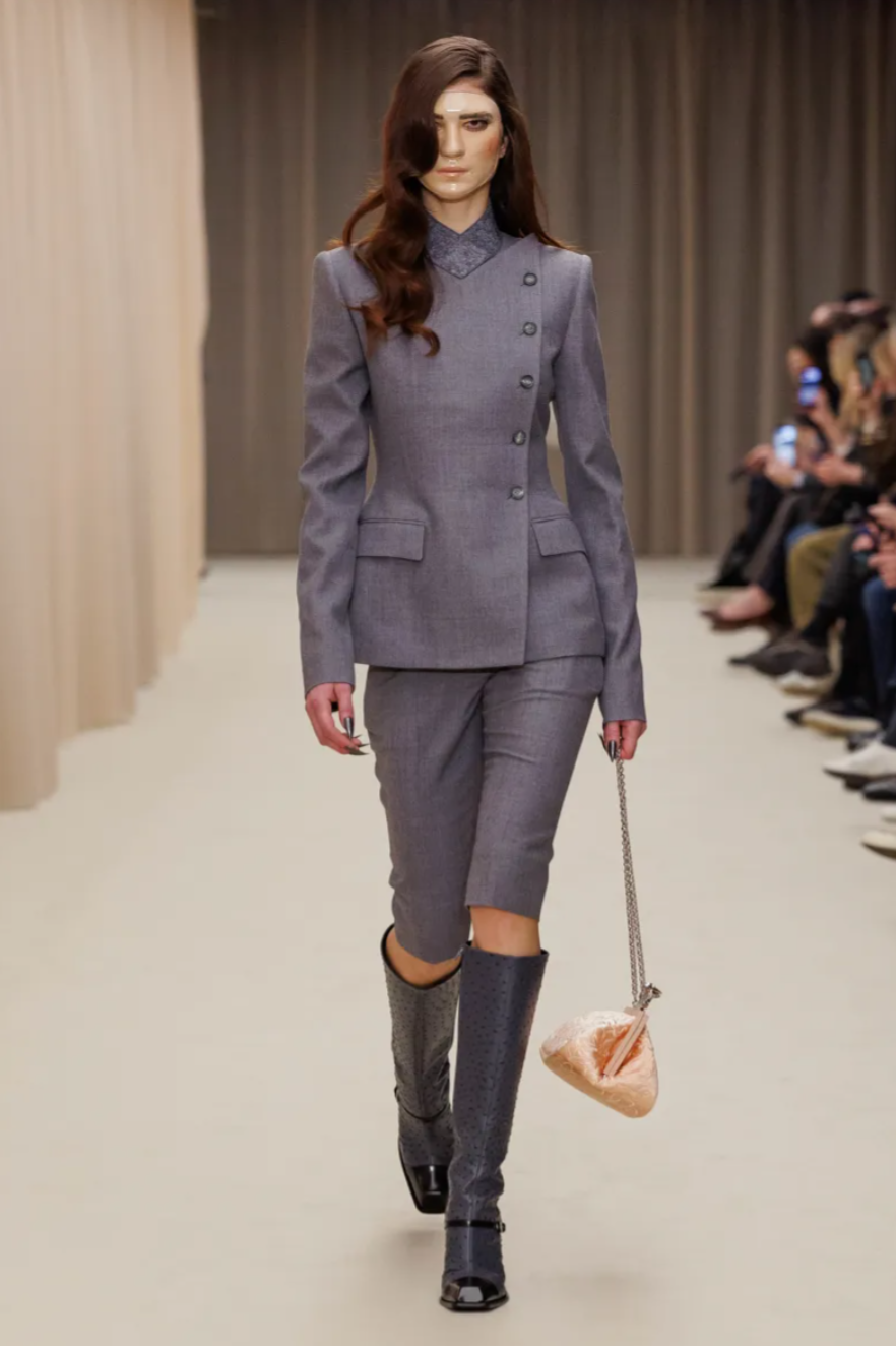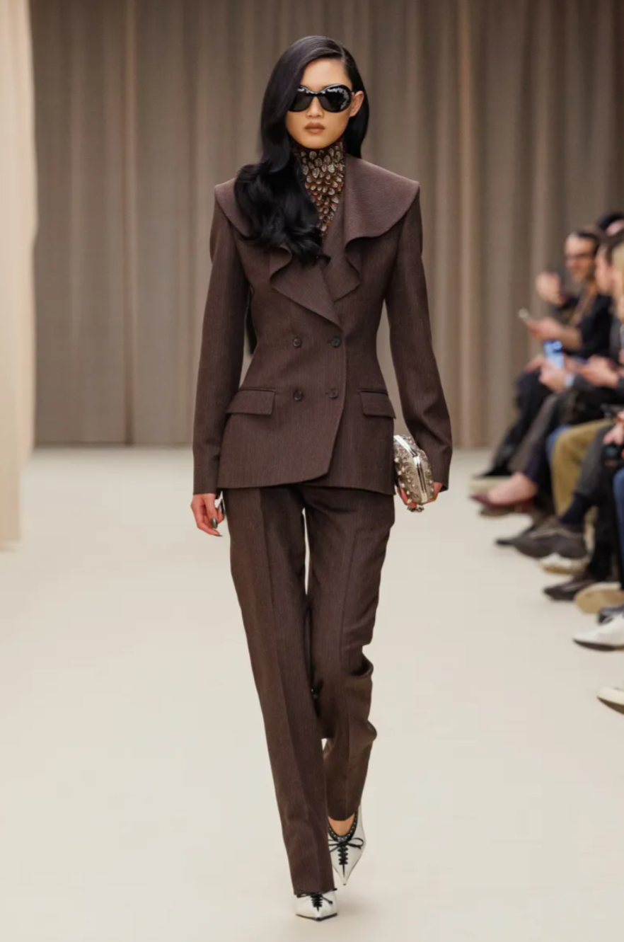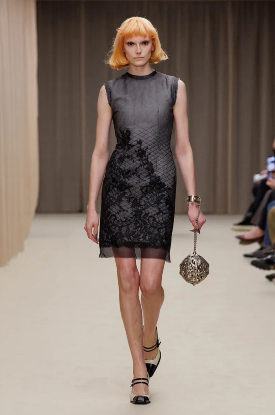 For all its references, the McQueen Fall 2026 collection remained grounded in the street. Mod inspired knee boots and miniskirts brought a youthful edge, including sculptural designs moulded from the body of model Marcele Dal Cortivo. Other surreal details pushed the McQueen Fall Winter 2026 show into uncanny territory, including plastic masks worn by models whose hair was sculpted into immaculate waves. At a moment when the house’s parent company Kering is pushing for stronger commercial performance, the McQueen Fall 2026 collection balanced sellable tailoring and eveningwear with the dark romanticism that continues to define the McQueen legacy.