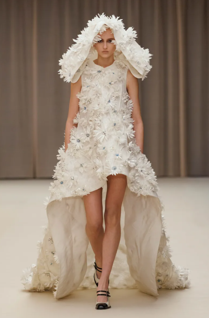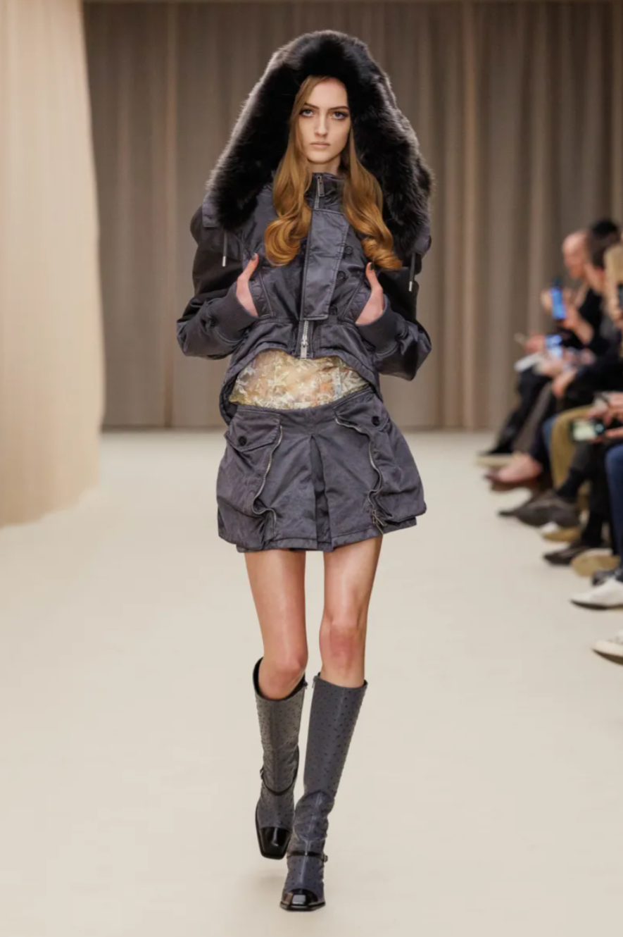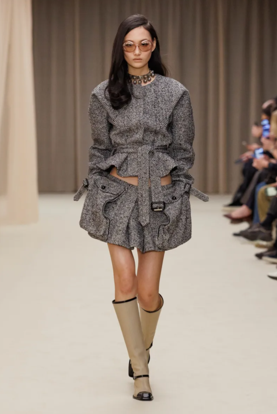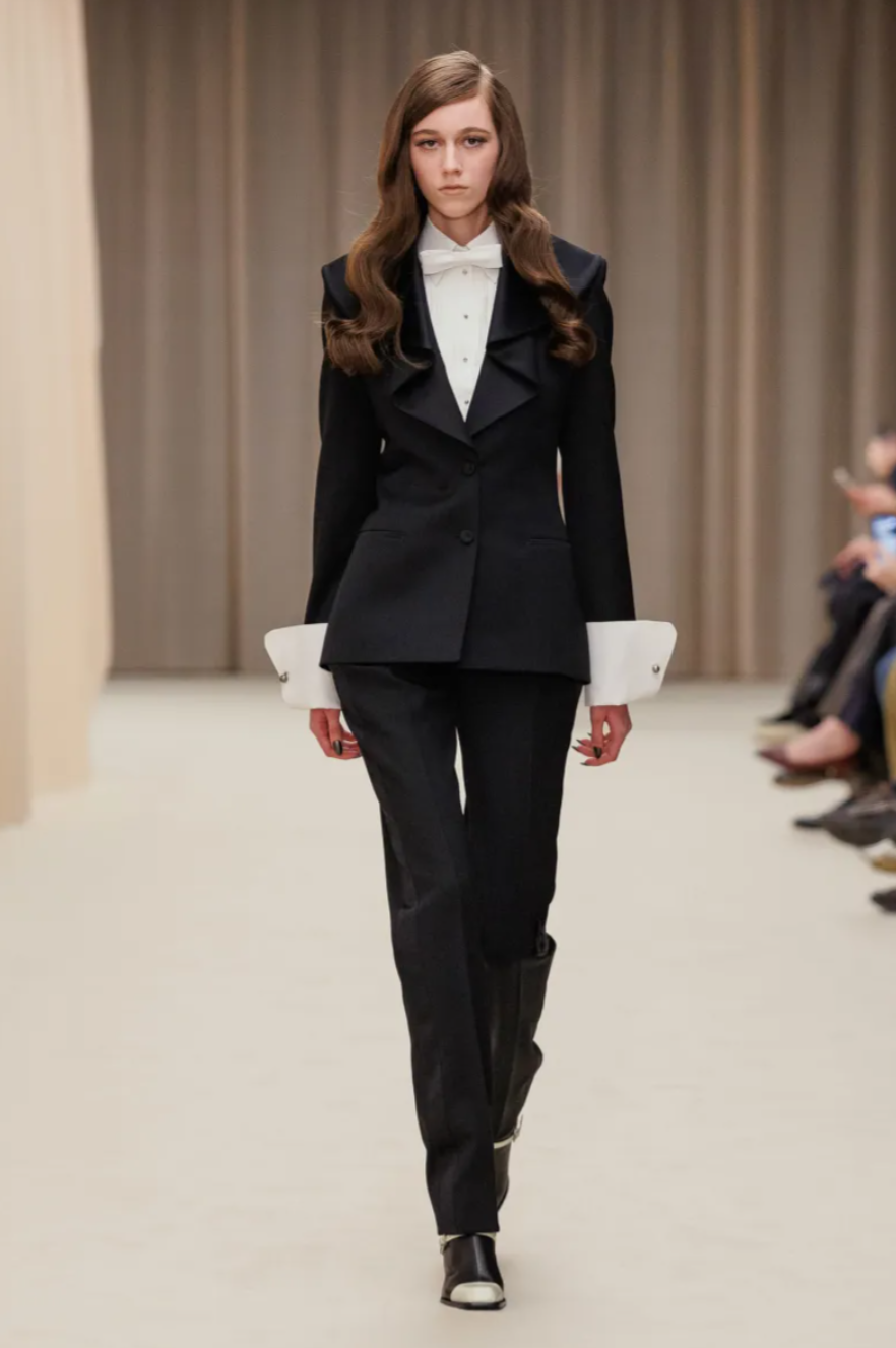 For all its references, the McQueen Fall 2026 collection remained grounded in the street. Mod inspired knee boots and miniskirts brought a youthful edge, including sculptural designs moulded from the body of model Marcele Dal Cortivo. Other surreal details pushed the McQueen Fall Winter 2026 show into uncanny territory, including plastic masks worn by models whose hair was sculpted into immaculate waves. At a moment when the house’s parent company Kering is pushing for stronger commercial performance, the McQueen Fall 2026 collection balanced sellable tailoring and eveningwear with the dark romanticism that continues to define the McQueen legacy.