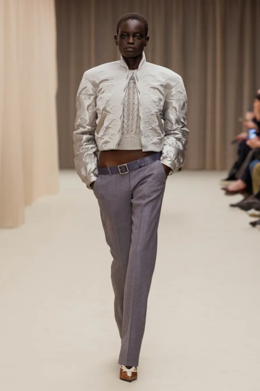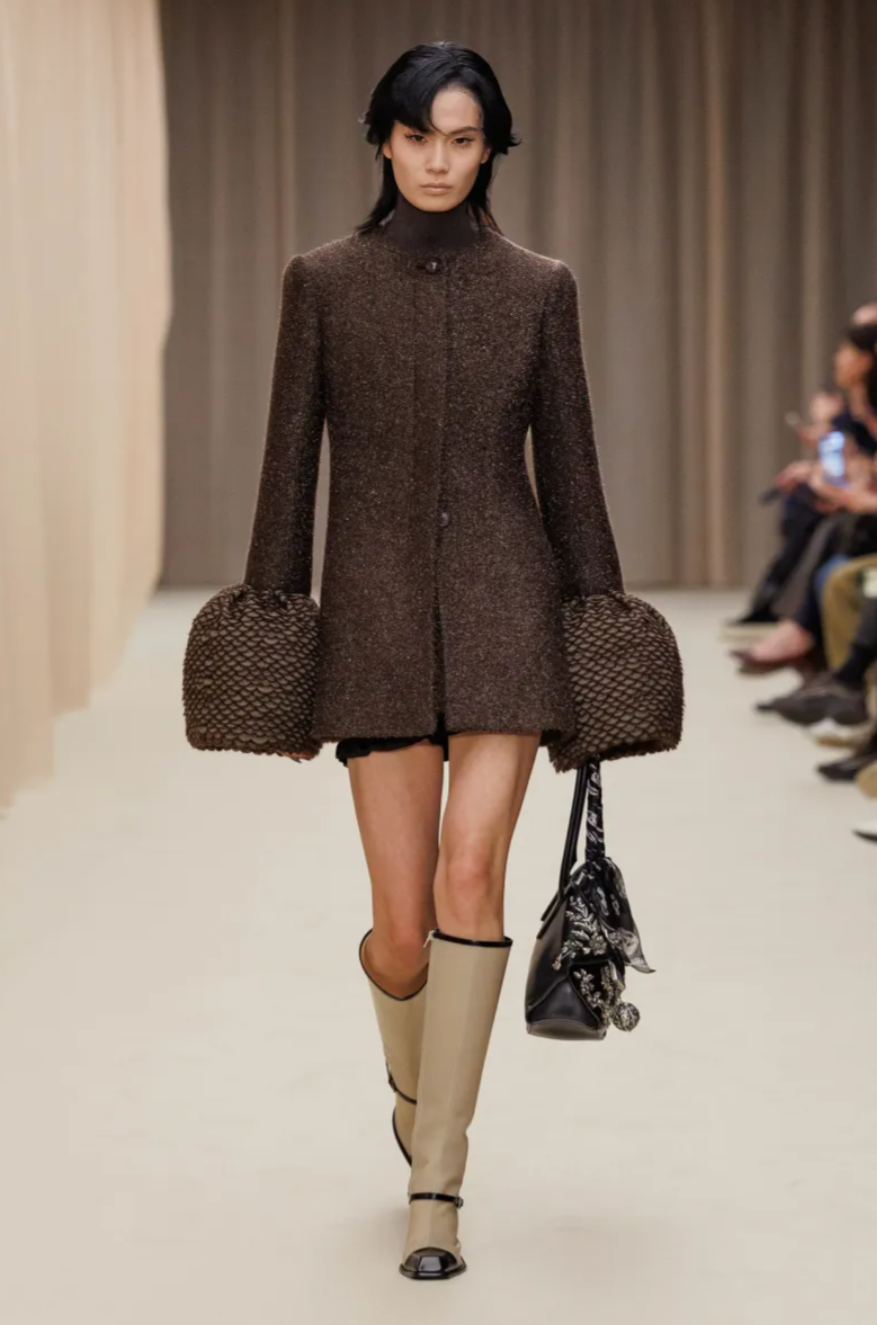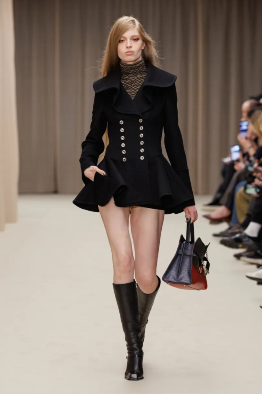 The McQueen Fall 2026 runway unfolded inside a flesh pink curtained set designed by Tom Scutt and accompanied by an eerie score from A. G. Cook. Within that atmosphere, the McQueen Fall Winter 2026 collection rested on three pillars: sharp tailoring, Carnaby Street attitude and boudoir inspired detailing. Jackets with single hook closures in Mikado silk and crushed jacquard nodded to Lee Alexander McQueen’s 1996 La Poupée collection, while sculptural collars curved around the neckline of flared peacoats worn as ultra short dresses. Throughout the McQueen Fall 2026 collection, the designer moved freely between the house archive and the present moment, revisiting signature motifs such as feathered jackets and chainmail, which reappeared here as trompe l’oeil embroidery and a silver knit sweater constructed from thousands of metallic rings.
