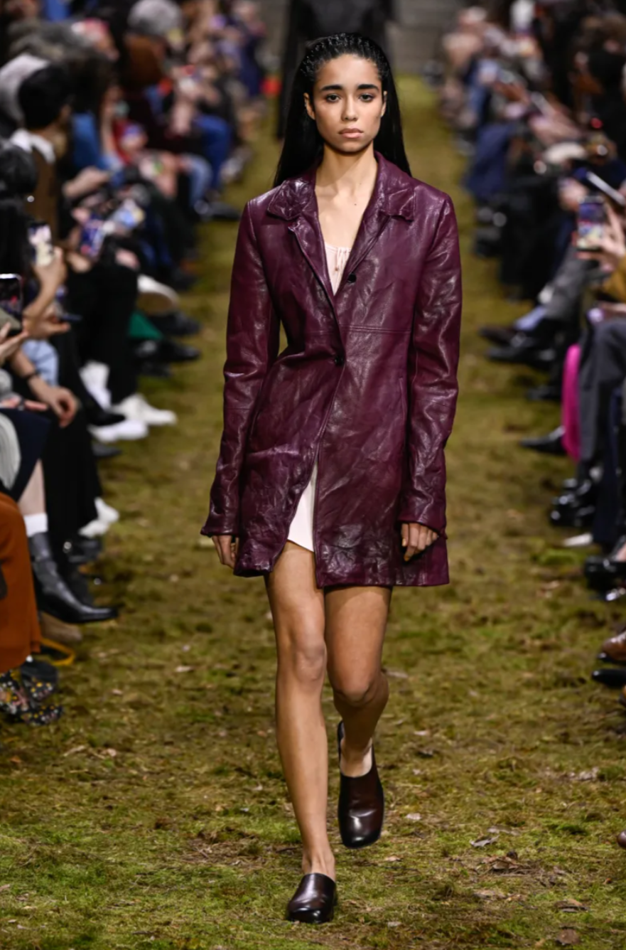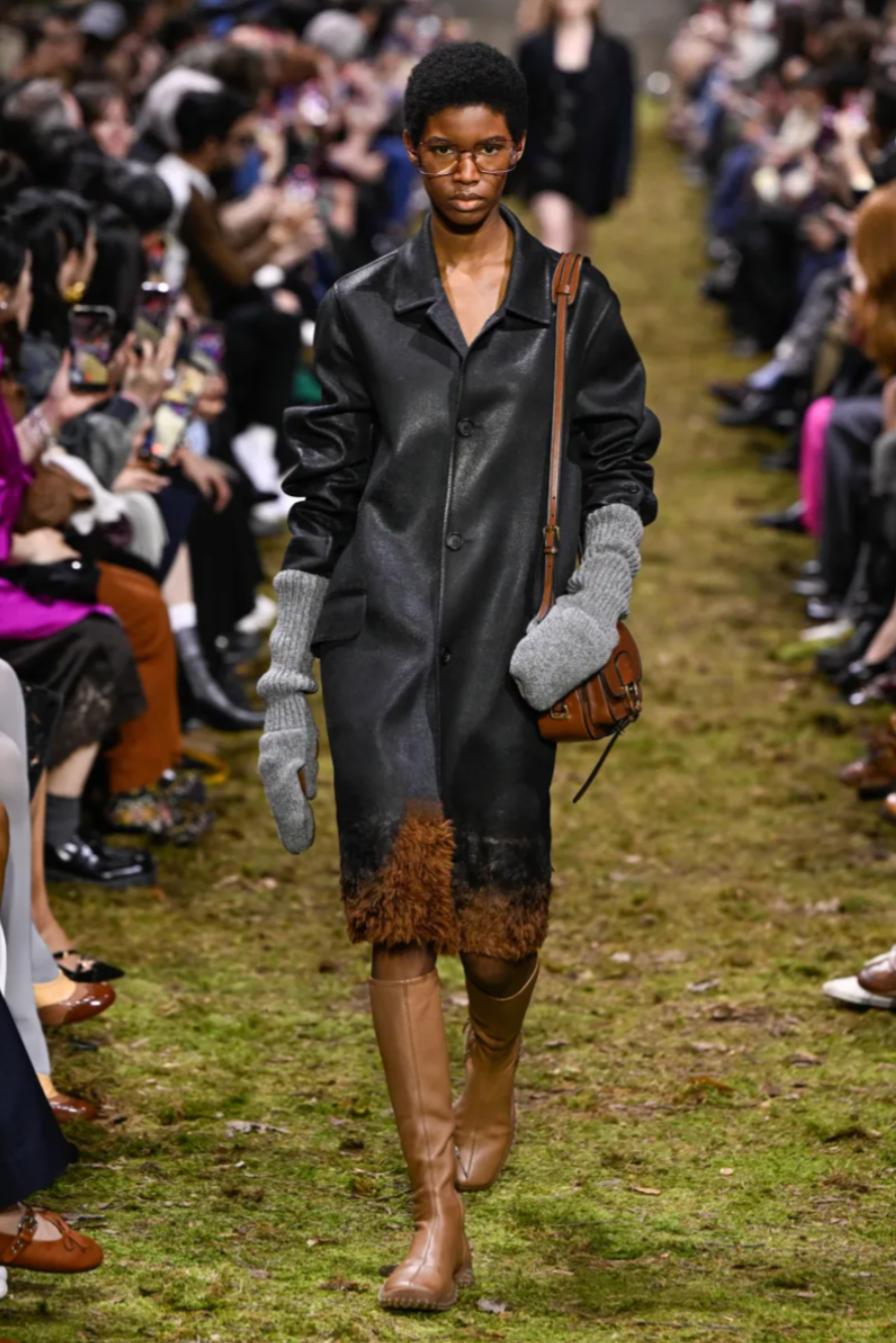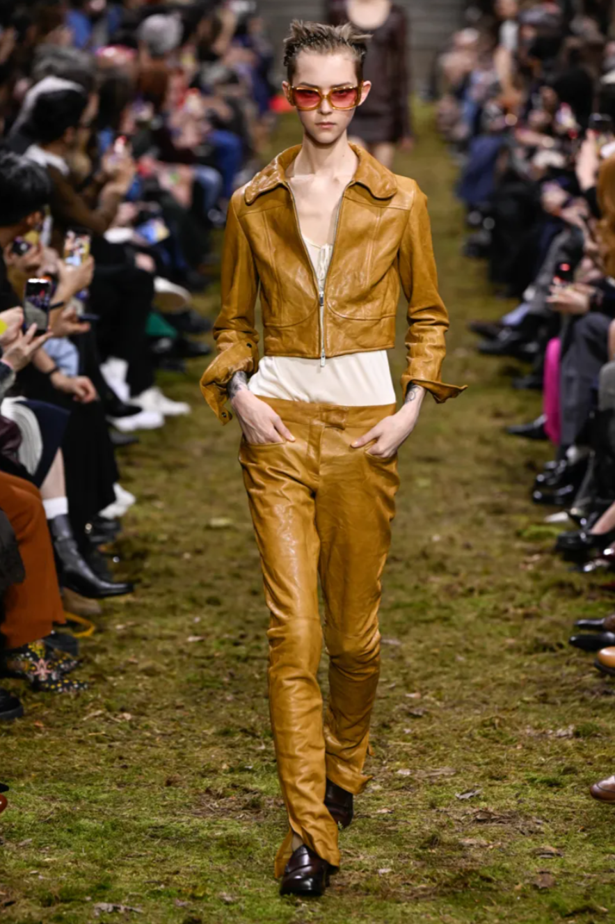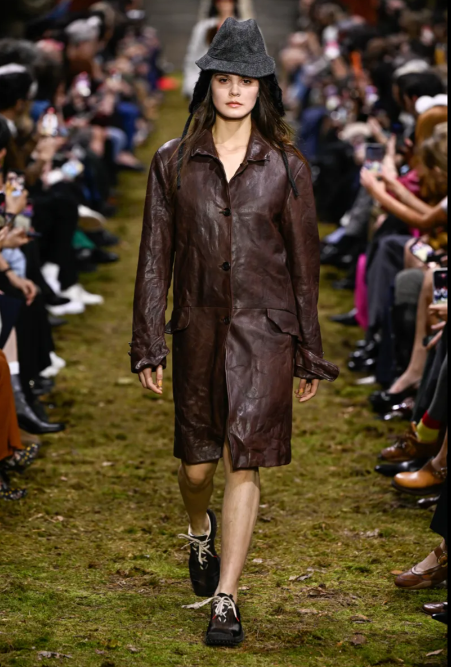 That philosophy shaped the mood of the Miu Miu Fall 2026 collection, which leaned into garments that felt worn, personal and intimate rather than protective. Tiny tank dresses, crinkled cotton blazers and shrunken washed leather jackets appeared deliberately lived in, as if they were the last surviving pieces of a much loved wardrobe. Slim coats with high belts were paired with flared trousers that dragged lightly across the soil runway, reinforcing the grounded atmosphere of the Miu Miu Fall Winter 2026 show. Some pieces carried a DIY quality, including heavy leather coats with shaggy hems and cropped windbreakers lined with shearling, suggesting gentleness and vulnerability rather than armour.