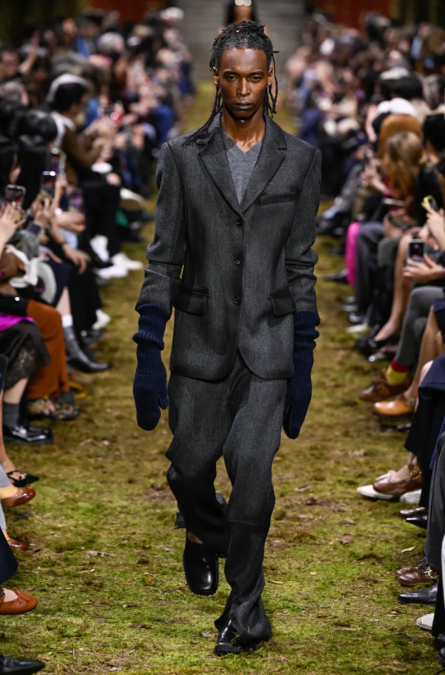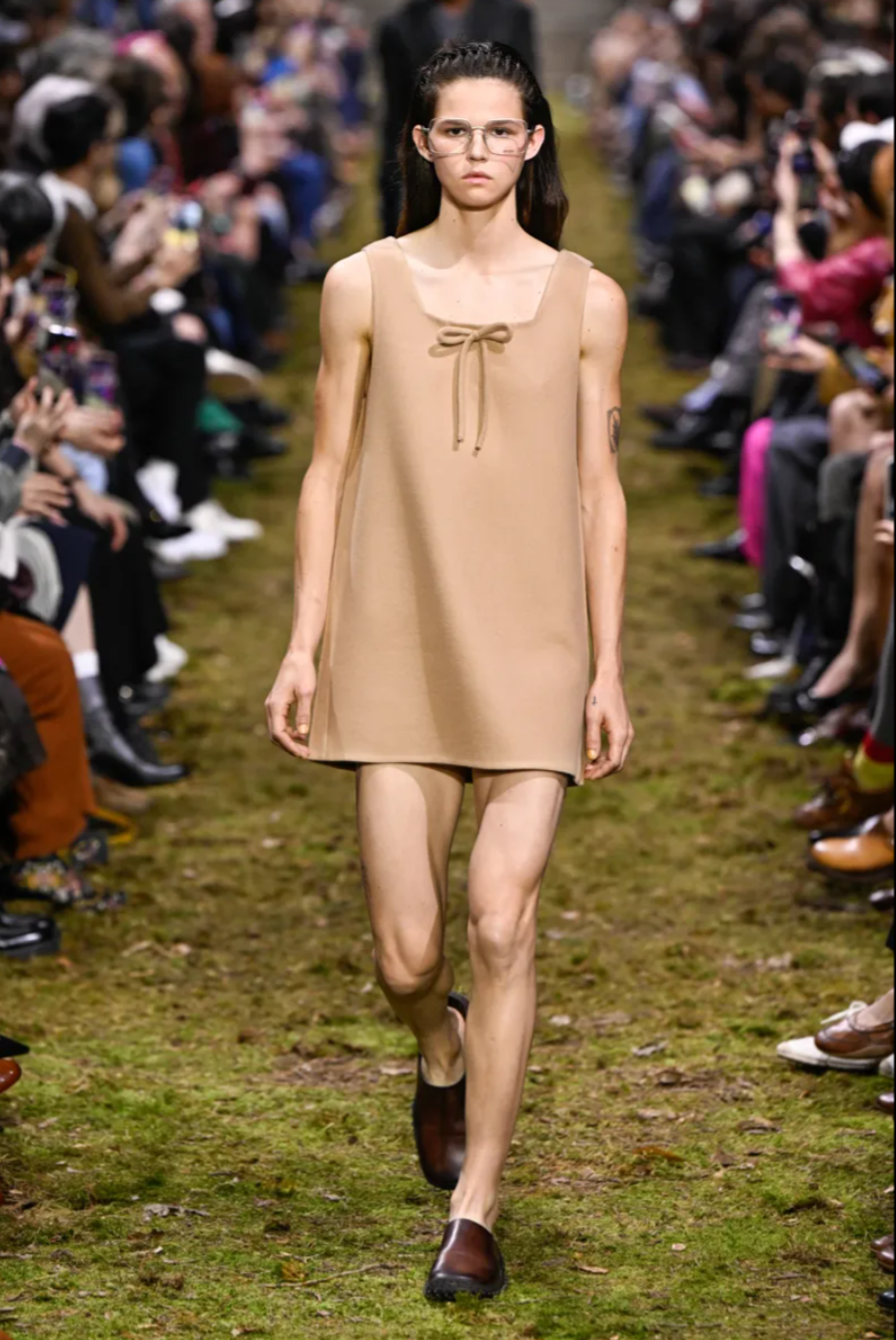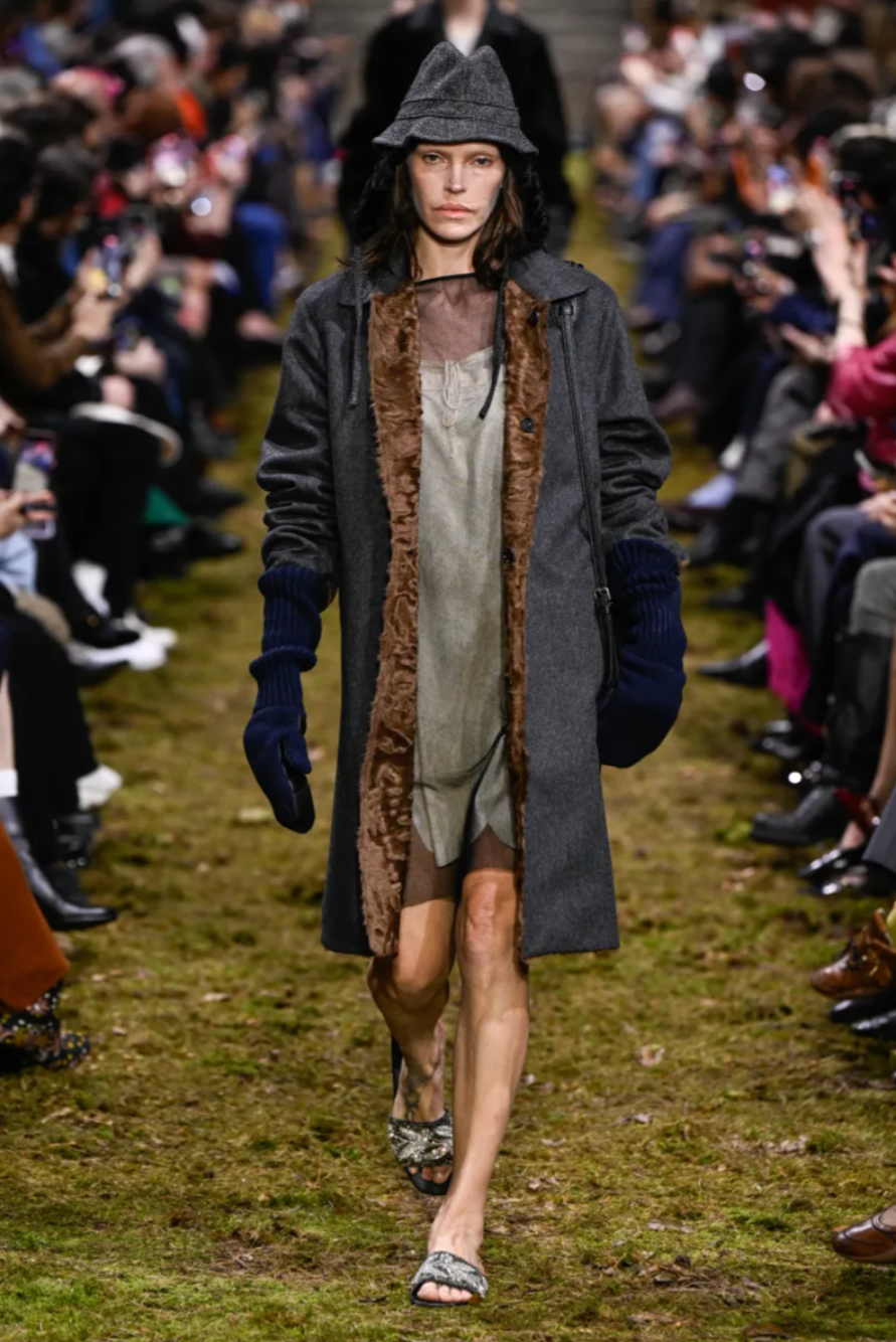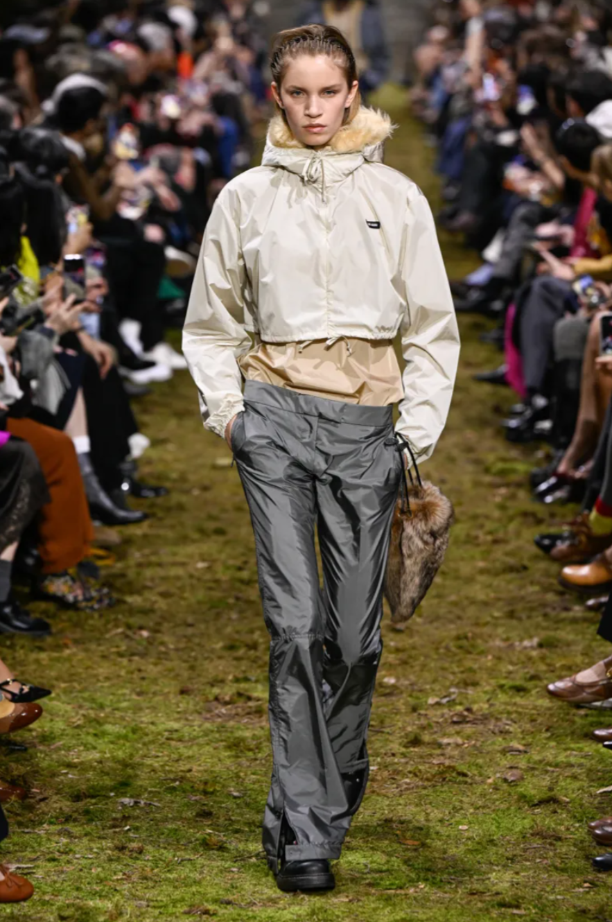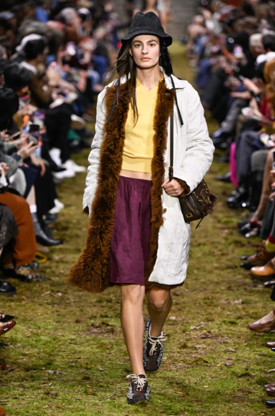At Paris Fashion Week, Miu Miu closed the season with the Miu Miu Fall 2026 collection, presented by Miuccia Prada on a runway designed to resemble a churned horse racing track scattered with twigs and earth. The setting echoed a broader theme seen across the week, where houses such as Hermes and Louis Vuitton also explored nature through their show environments. For Prada, however, the Miu Miu Fall Winter 2026 collection was less about escapism and more about reflecting on the scale of the individual within the wider world. As she explained backstage, the concept centred on the idea that the human body and mind should be enough to face whatever happens.