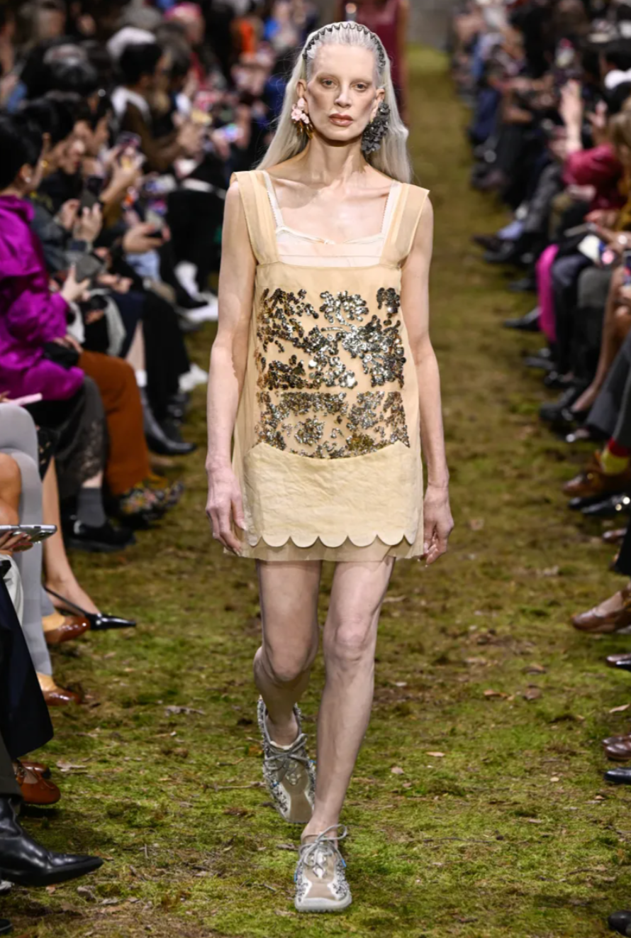 The casting and accessories added further dimension to the Miu Miu Fall 2026 collection. The runway featured a multigenerational mix of faces including Gillian Anderson, Chloe Sevigny and Lily Newmark, alongside younger figures such as Zola Ivy Murphy and Sateen Besson. While the clothing evoked the understated minimalism of the 1990s, the accessories offered contrast through embellished chapkas, crystallised belts and decorated sneakers. Together, these elements gave the Miu Miu Fall Winter 2026 collection a balance of fragility and personality, reinforcing Prada’s belief that individuality itself can be a form of strength.