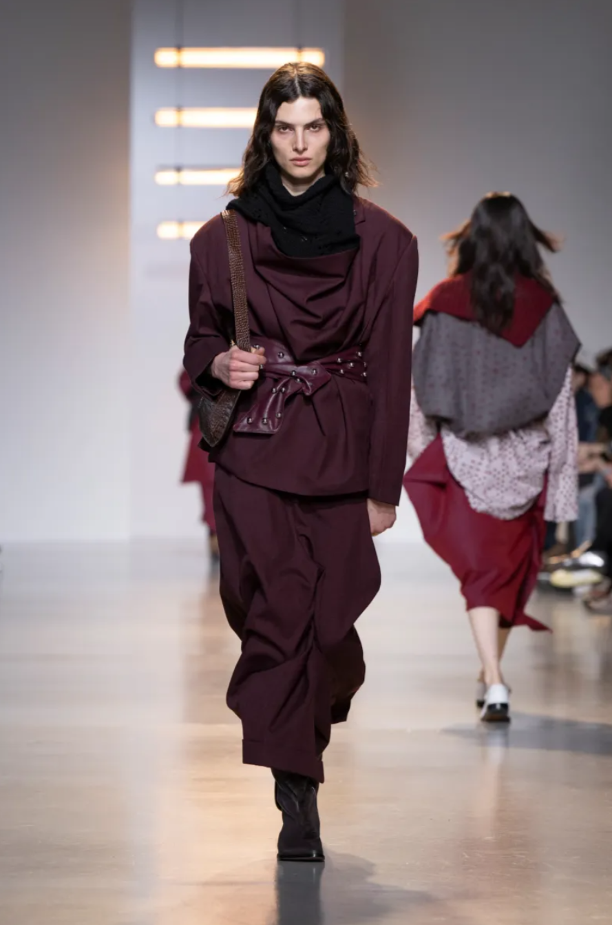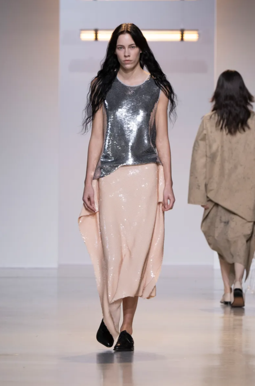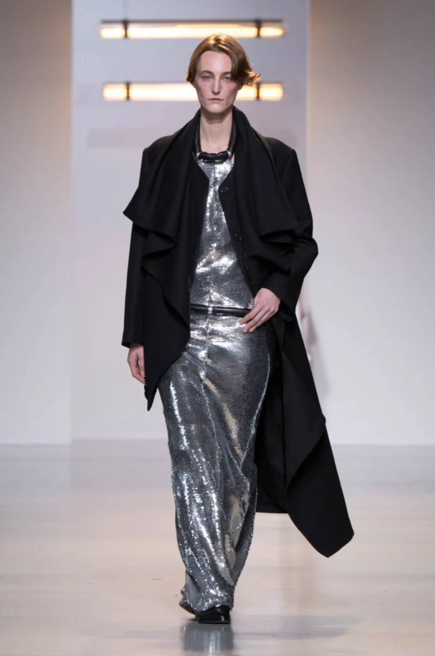 Silhouettes played with hybridity, a signature theme for the designer. Knitwear was layered in unexpected ways, including a one sleeve sweater draped over a crisp shirt so that the second sleeve hung forward like a scarf. Skirts and coats opened into inverted pleats at the back, creating cocoon like volumes that lifted away from the body. Men’s trousers were cut high at the waist and sliced at the knee to form pant skirt hybrids, while long skirts twisted and slit along the leg, dissolving the line between tailoring and drapery. Even the eveningwear followed this logic: sequined gowns in silver and pale peach shimmered with glamour, yet were paired with flat boots or brogues, grounding the look in something deliberately pragmatic. The result was a collection that felt both primal and precise, a reminder that Pasqualetti’s real subject is not clothing alone but the strange, shifting relationship between the body and the objects we place upon it.